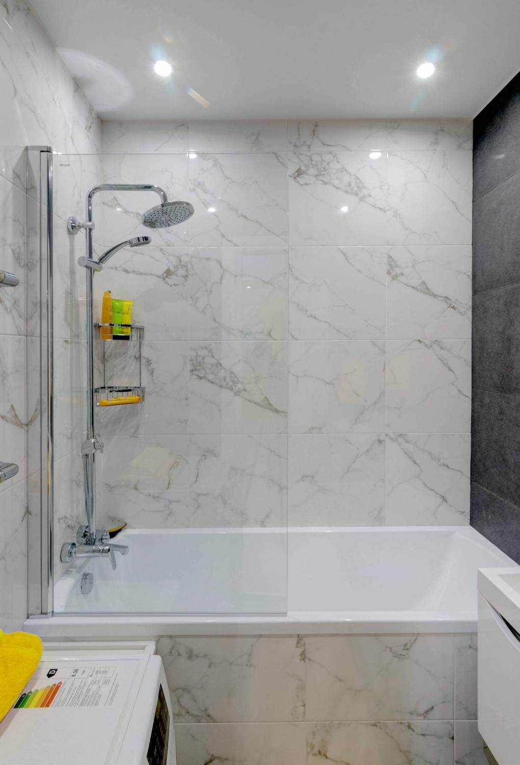 Маленькая ванная — не помеха для дизайнеров, которые стремятся сделать помещение максимально функциональным. В нём можно организовать мини-прачечную, поставив на стиральную машину сушильную. Если комната занимает 3-4 метра, вместо ванны придётся разместить душевую кабину с невысоким поддоном и перегородкой, чтобы машинки оказались “спрятанными” в удобной нише.