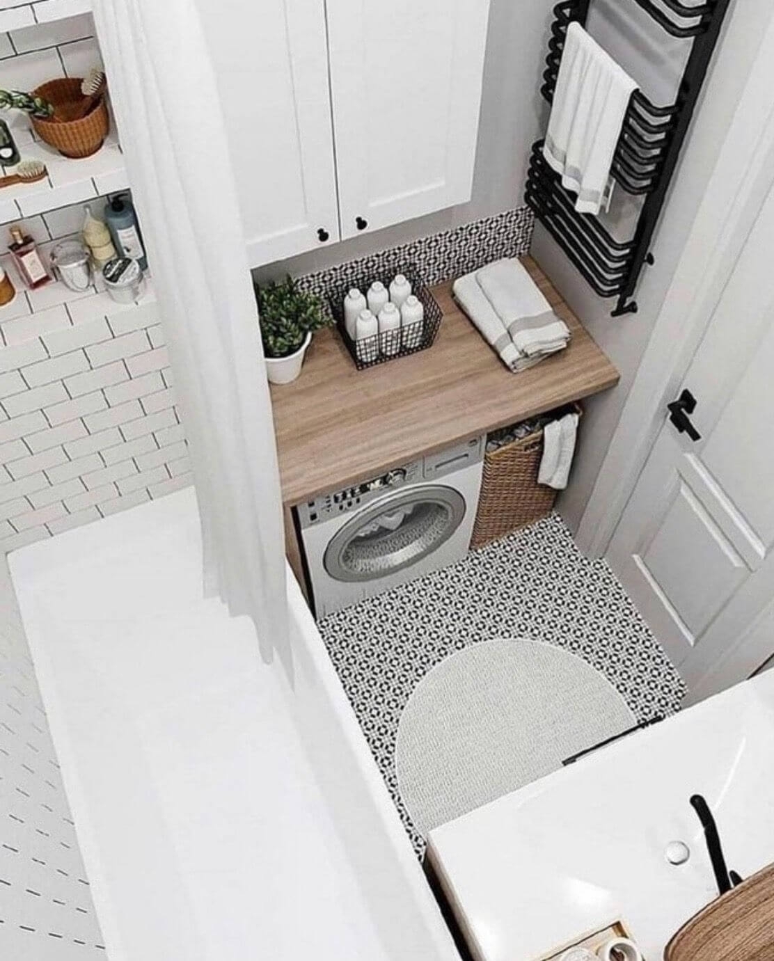 Темный плиточный пол создает точку отсчета для глаз, а контрастные светлые цвета плитки вокруг придают комнате более воздушный вид, это обман зрения, но он работает.