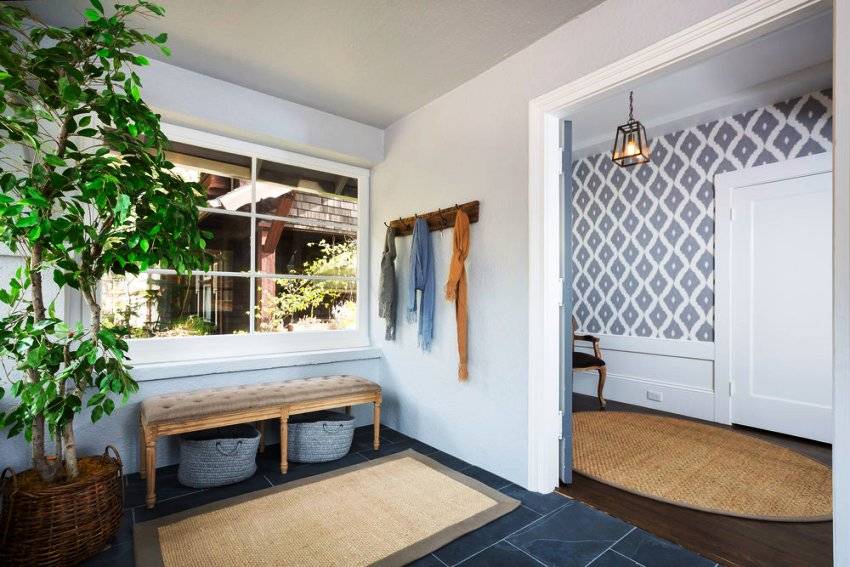 Сочетание современности и уюта. Такая прихожая обязательно должна быть светлой. Органично будут смотреться природные узоры, мелкие цветочные принты, а также естественные оттенки.