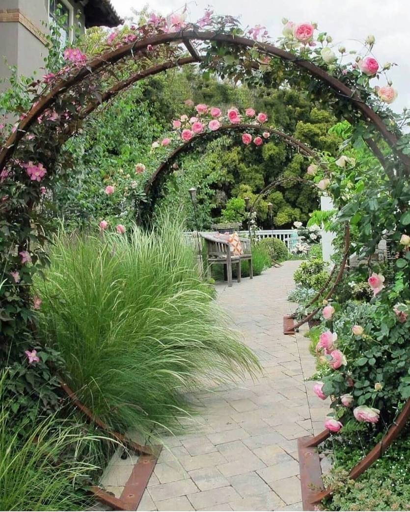 - Арки в дальнем конце аллеи зрительно продлевают линии вверх, что визуально увеличивает участок.