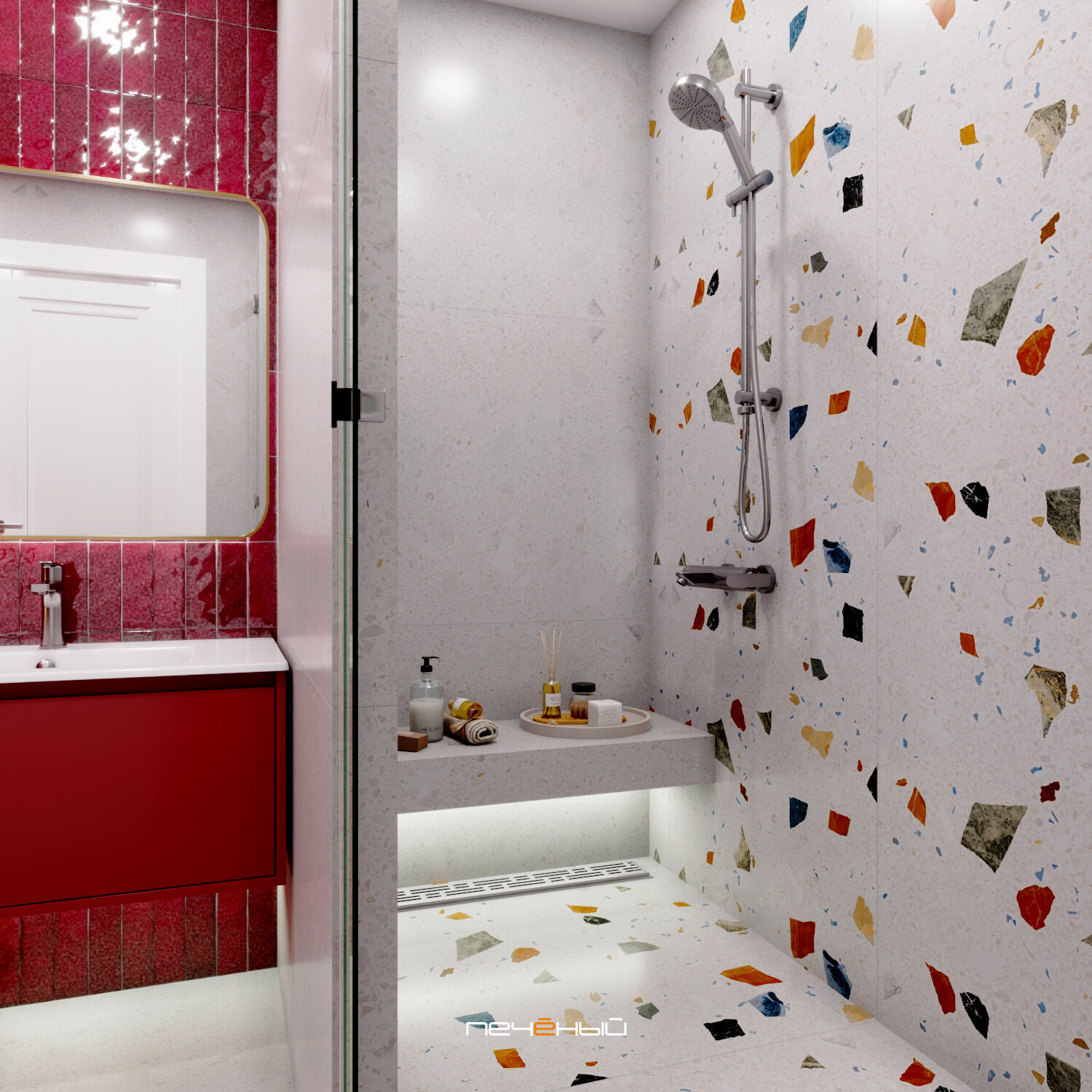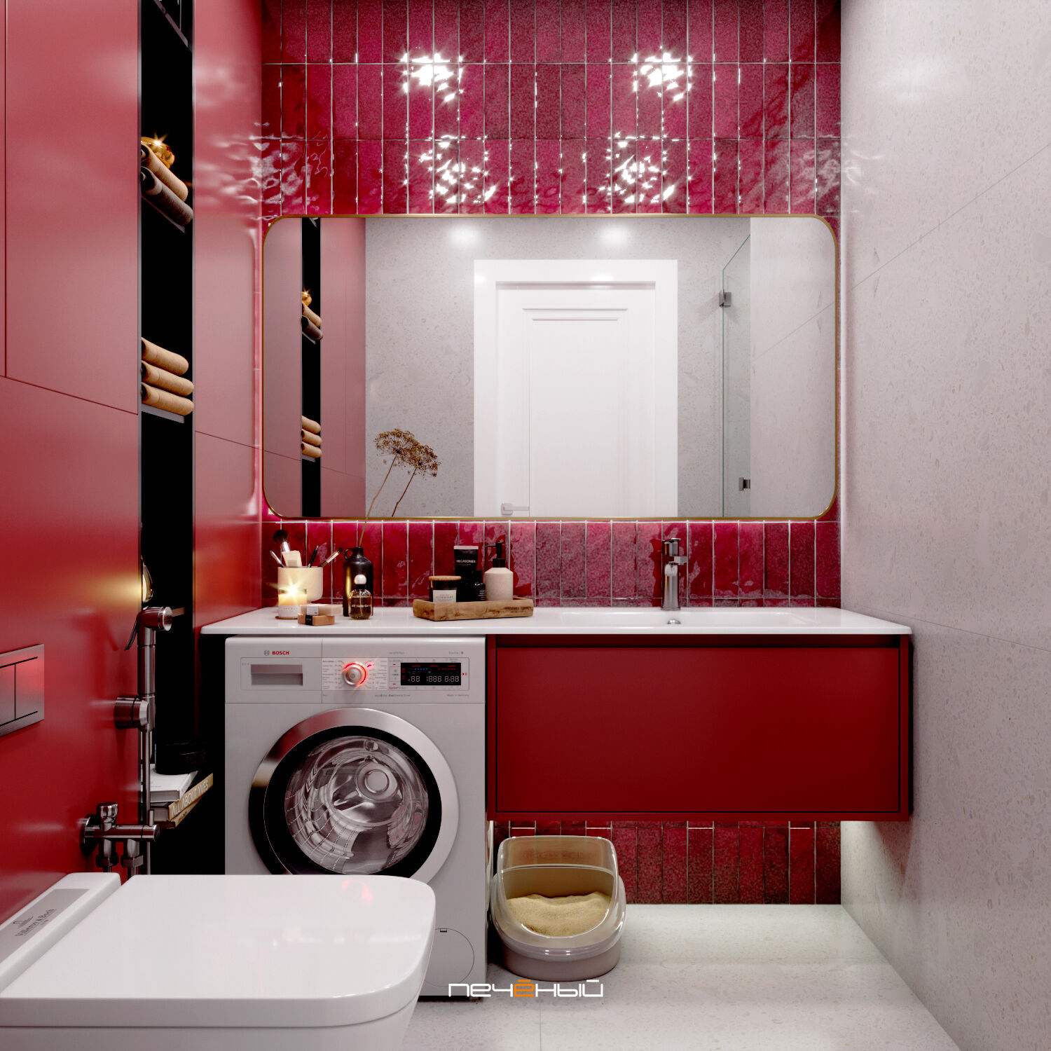 Дизайн-ремонт совмещённого санузла в сталинке. Сочный ягодный оттенок плитки в ванной — такого вы явно ещё не видели! Частичная перегородка отделяет душевую зону. Кстати, там есть ещё сдвижная часть, которая убережёт санузел от брызг воды.