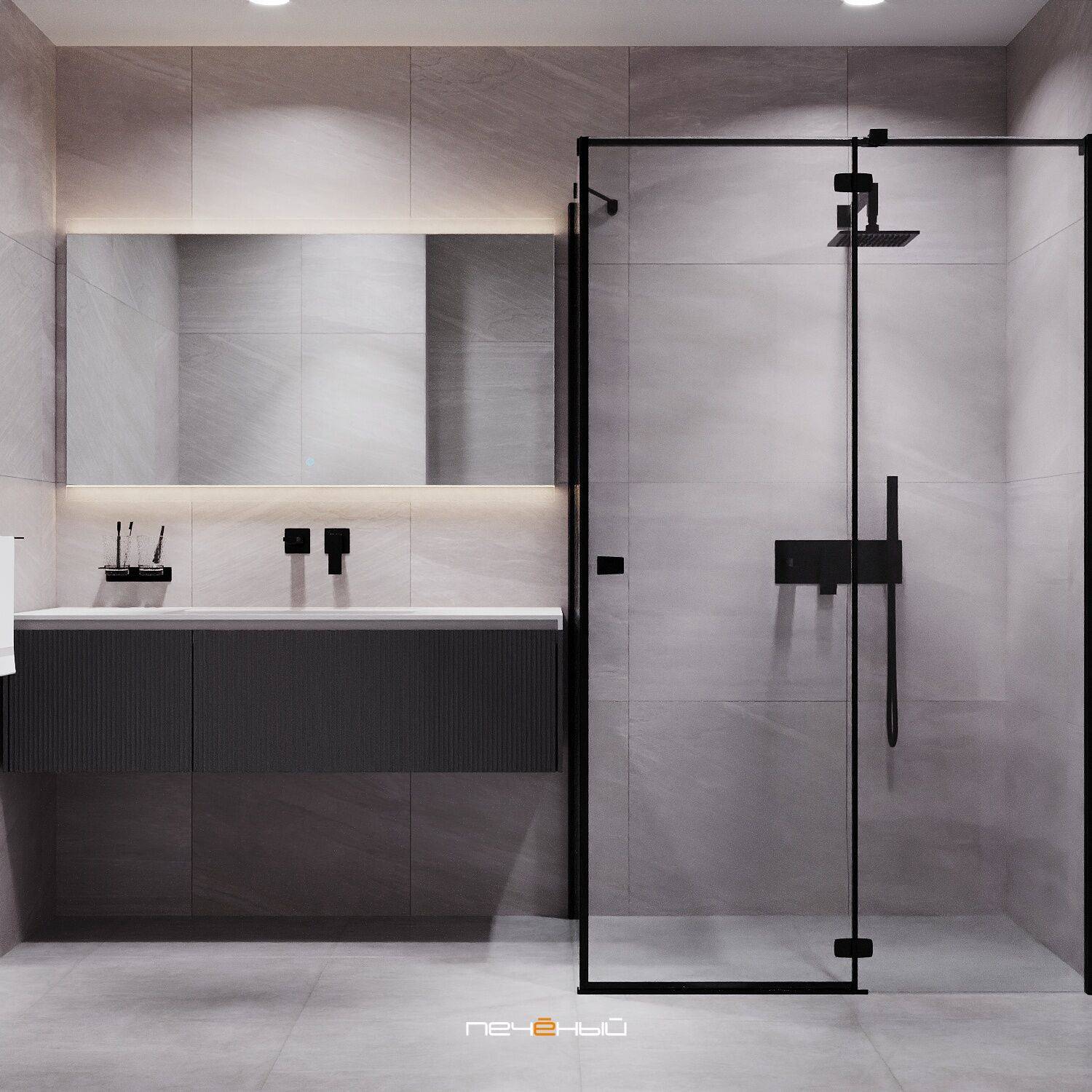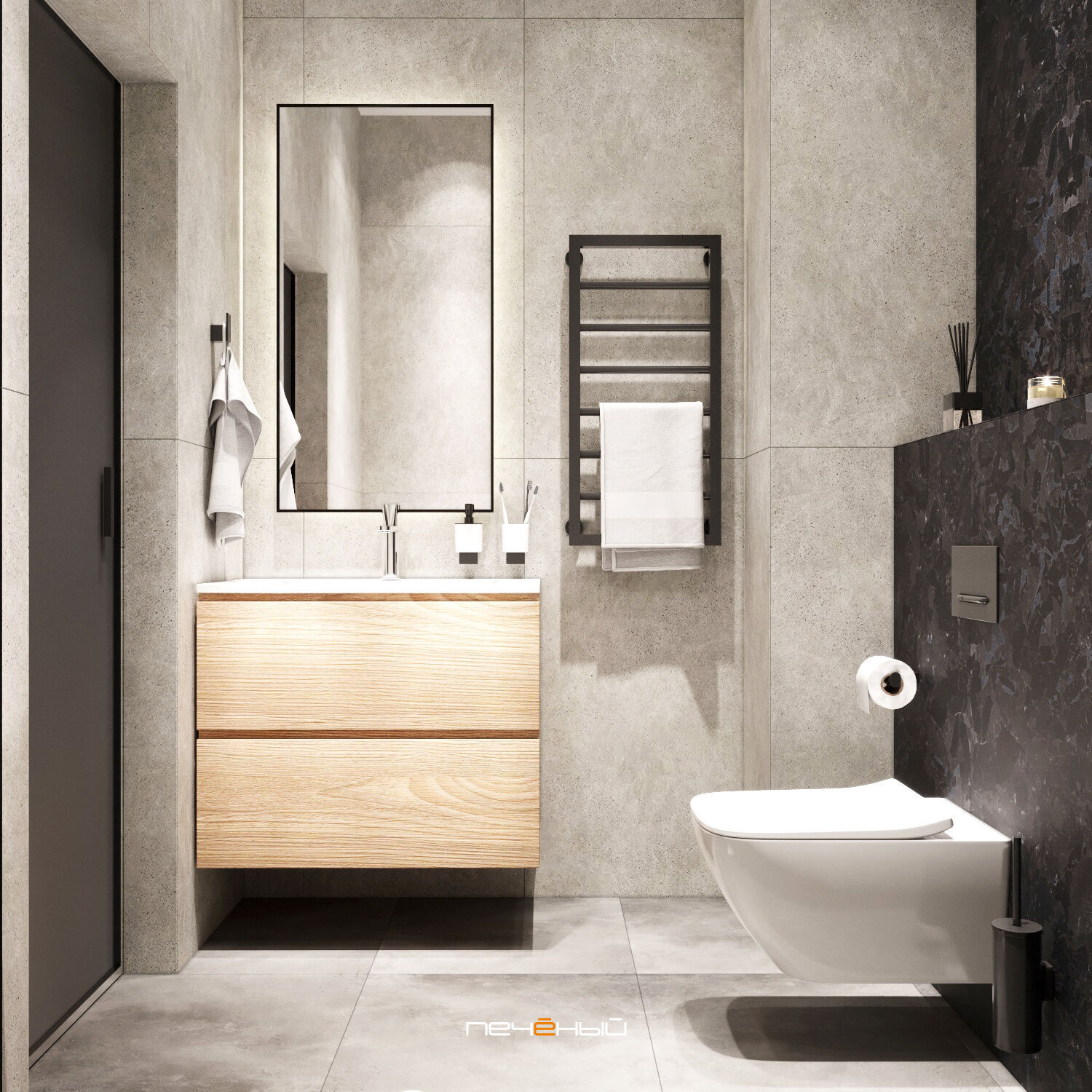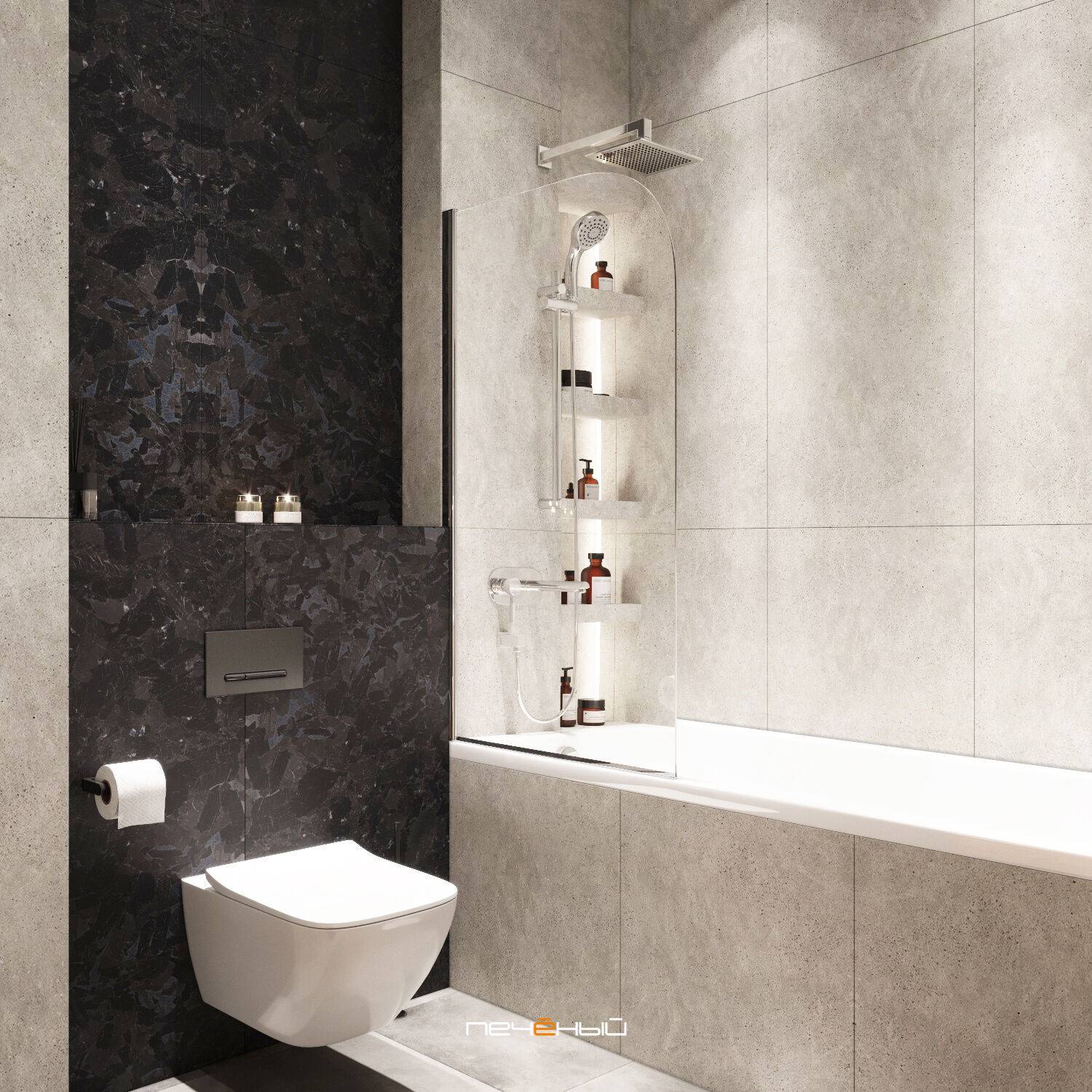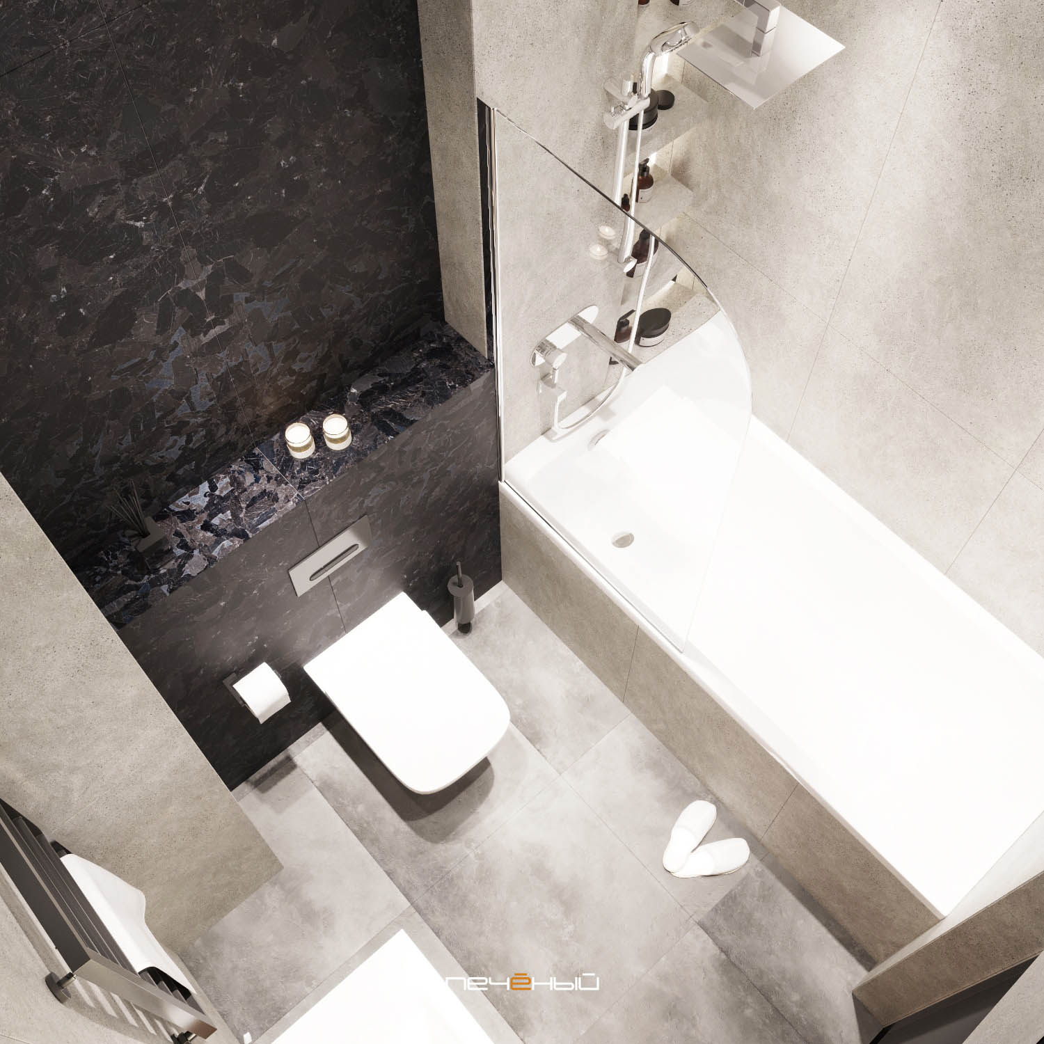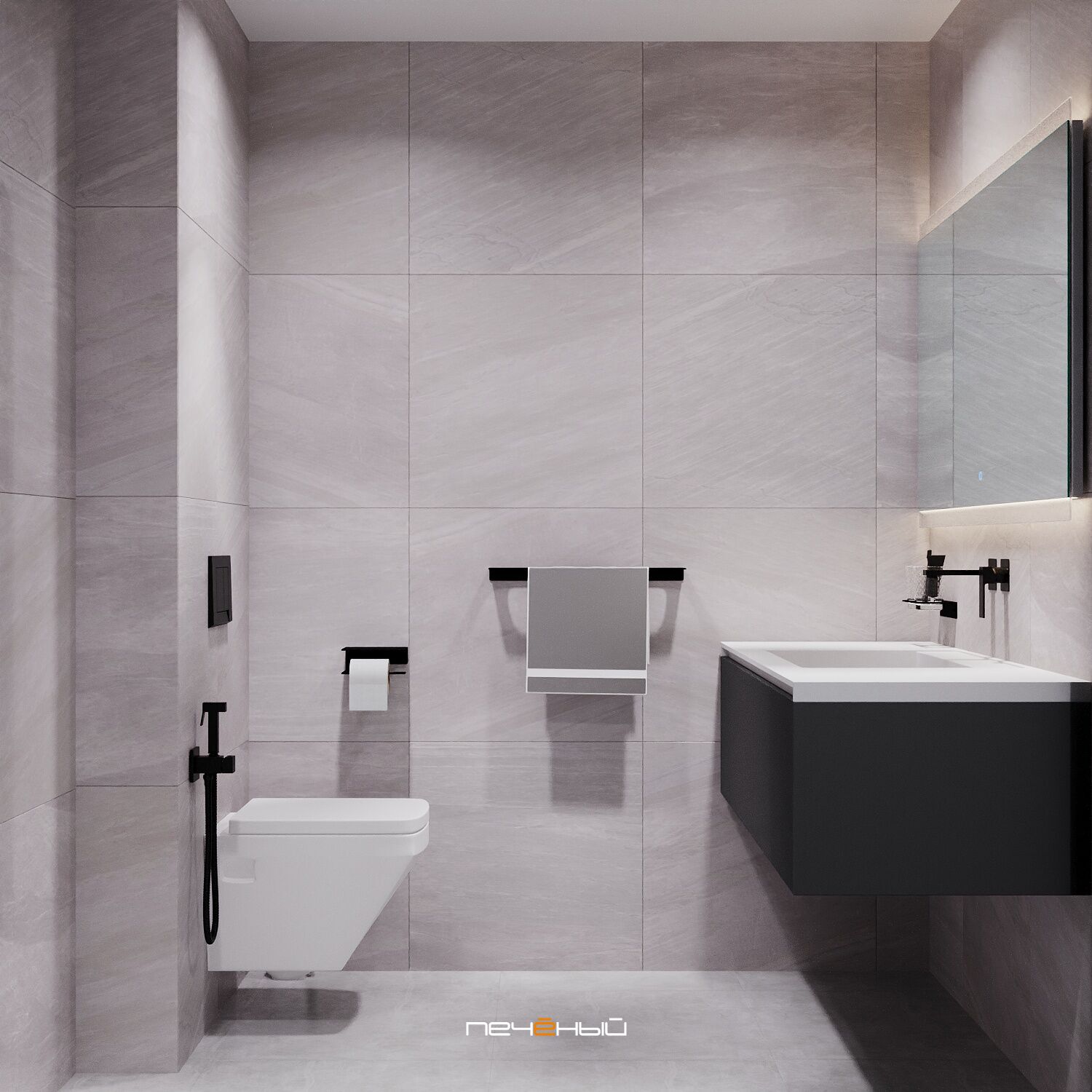 Стильный дизайн совмещённого санузла 5 кв. м. Очень графичный и стильный вариант оформления санузла в современном стиле. Благородная серая гамма, резанные, чёткие линии — получилось лаконично и очень красиво!