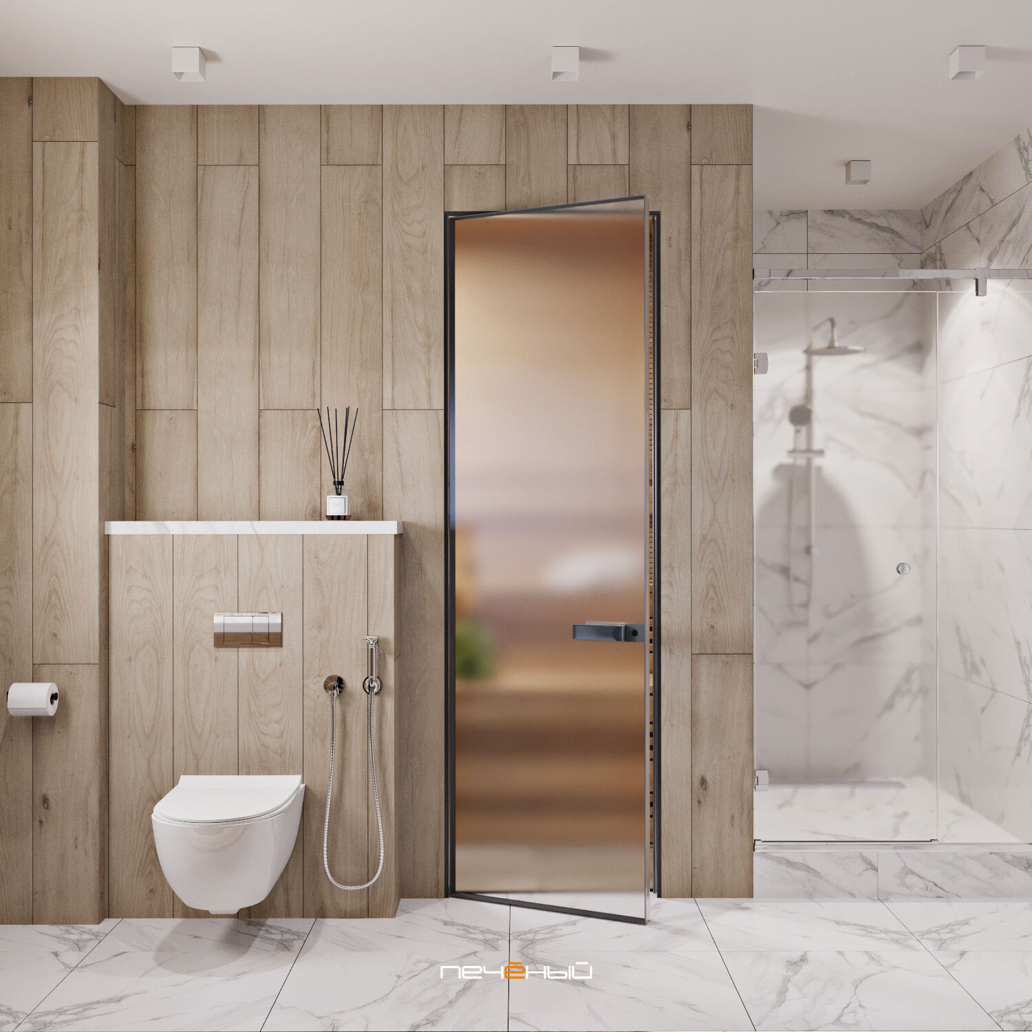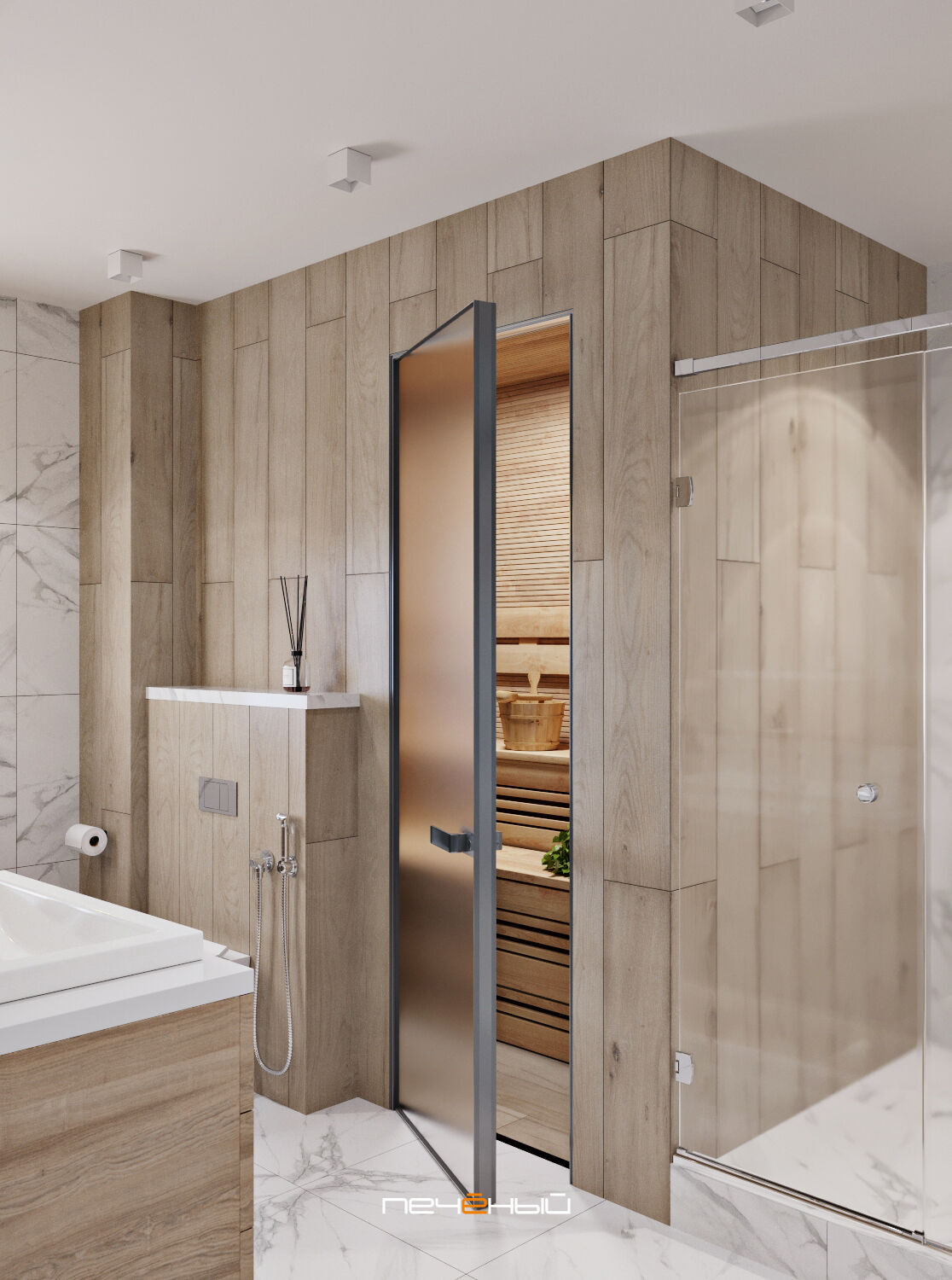 Санузел совмещённый — дизайн с сауной. Да-да, такое тоже бывает. Но, конечно же, не в квартире, а в загородном доме. Собственно, что тут ещё скажешь? Это просто круто!