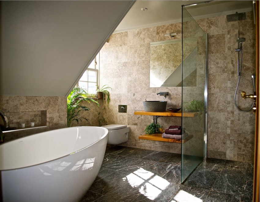 Мансардный совмещённый санузел в квартире. Дизайн подобного санузла встретишь не так уж часто, но нам вот в практике попался, поэтому он в подборке. 🙂 С подобным вопросом могут столкнуться как обладатели мансардных достроенных этажей в пятиэтажках, так и хозяева загородных домов