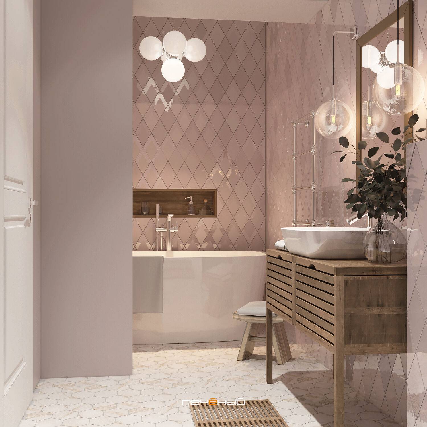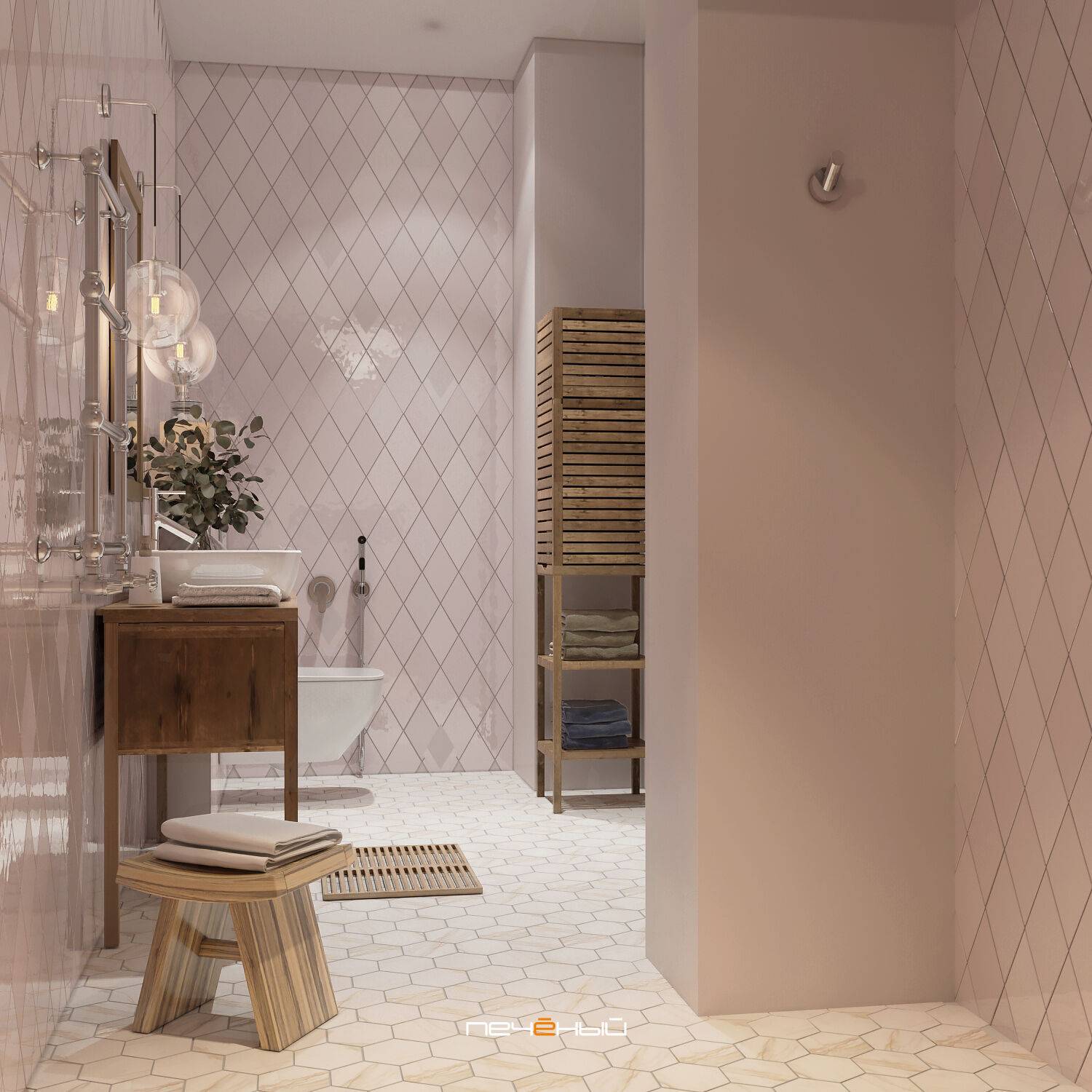 Этника и розовый цвет. Нежно-розовый дизайн совмещённого санузла и ванны. Фото лишь частично передаёт красивую игру света на этой глазурованной плитке! Получилось очень необычно и, благодаря деревянным этажеркам и шкафчикам, немного в этническом стиле.