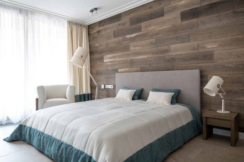 Отделка спальни деревянной вагонкой производит впечатление уюта и спокойствия. Она имеет отличные эксплуатационные качества: долговечная, при условии, что помещение сухое. Это натуральный и экологичный материал, но потребуется обработать специальным составом для защиты от вредителей.