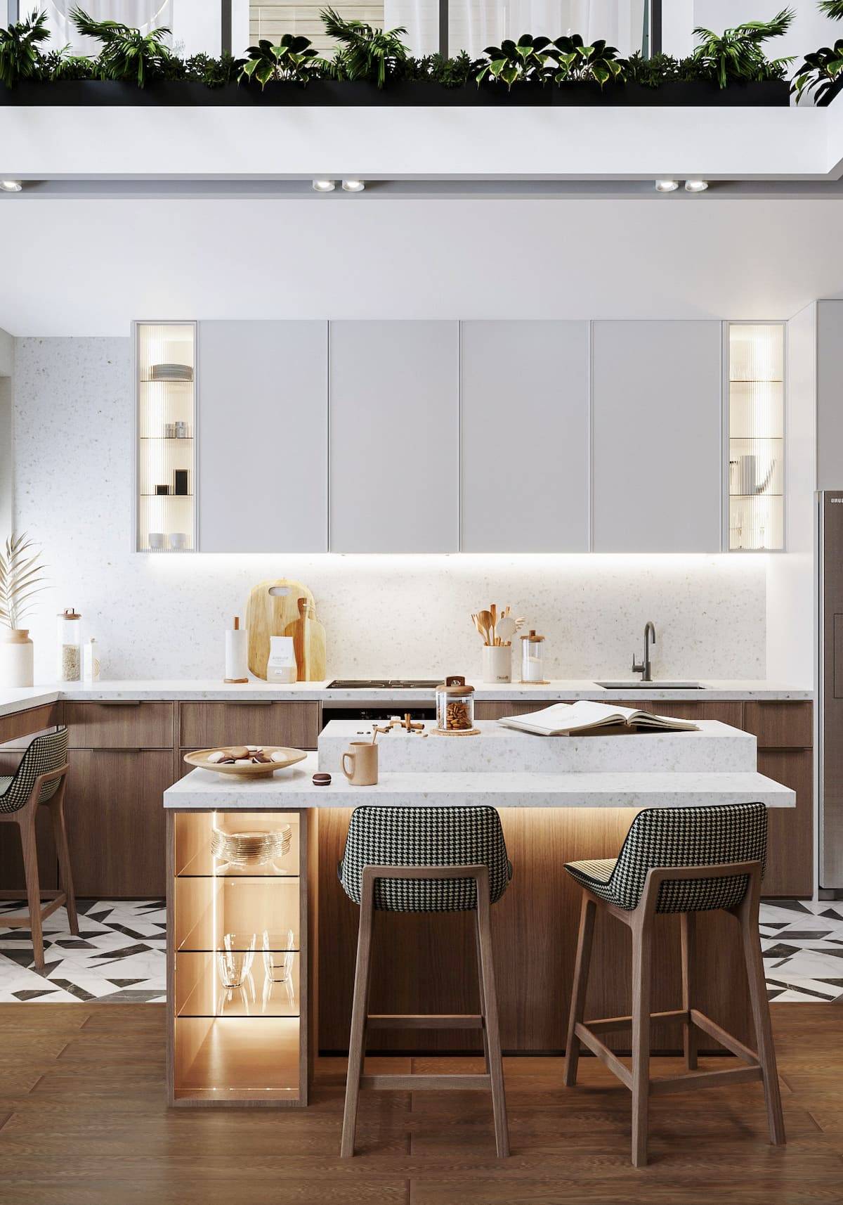 - Белый цвет подходит для всех вариантов дизайна. Он сочетается со светло-зеленым, голубым, желтым и красным, создавая плавный переход от одной функциональной зоны к другой.