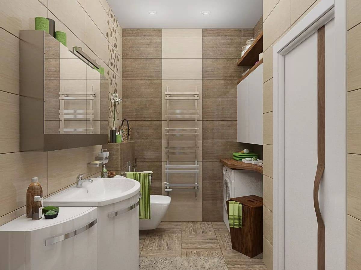 Дизайн ванной комнаты с туалетом и стиральной машиной зачастую затруднительно оформить, в силу крупных габаритов самой машины, которая займет много места. Поэтому, есть два выхода – либо приобретаем машинку с небольшими размерами и встраиваем ее, к примеру, в тумбу под рукомойником или ванной либо переносим в другое помещение.