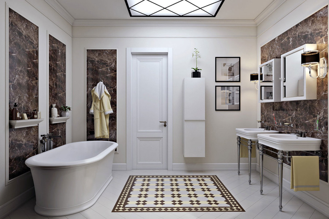 Для больших соединенных туалетов лучше выбирать цельные гарнитуры в общей манере. Идеальным стилем в этом случае станет классический.