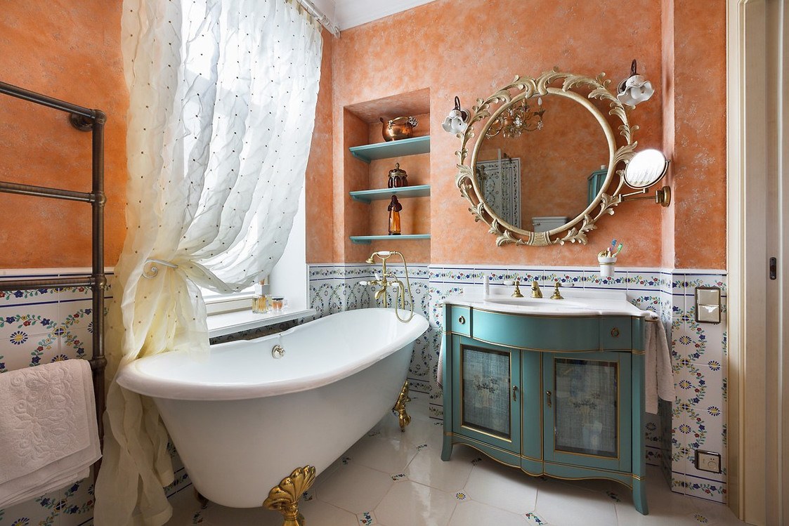 Превосходным решением станет украшающая штукатурка стен, состаренные зеркала, декор из естественных материалов (дерево, гранит, стекло), сантехника (монотонная либо с использованием декупажа). Легкая творческая беспорядочность сделает ванную комнату достаточно комфортной.