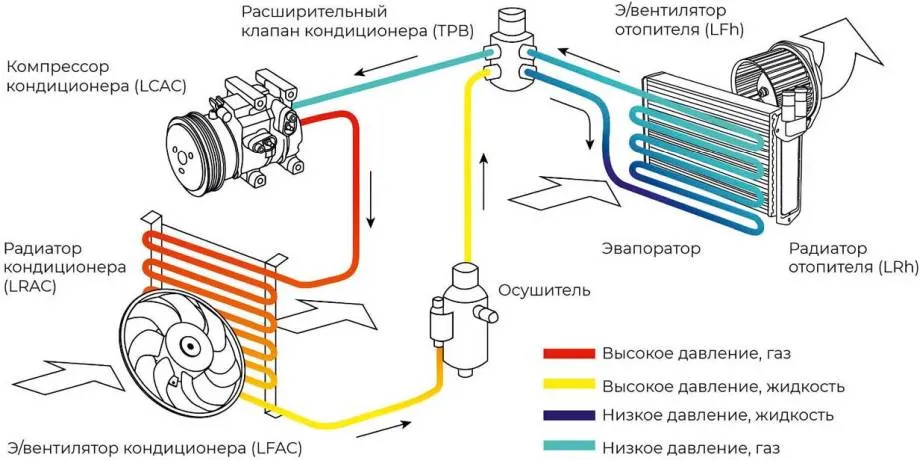 Основной принцип действия любой системы кондиционирования базируется на таких свойствах жидкостей, как поглощение тепла во время испарения и выделение его при конденсации. Во всех кондиционерах, направленных на охлаждение, конструкция похожа с незначительными изменениями, запатентованными брендом. Принцип действия климатического оборудования, предназначенного еще и для обогрева, также аналогичен.