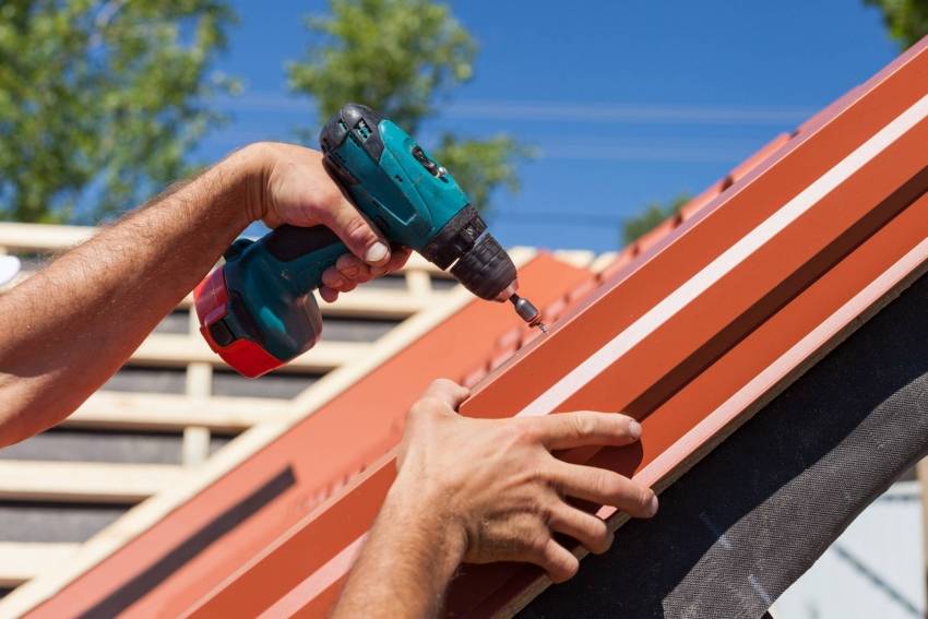 Листы металлопрофиля прикрепляются к обрешетке. Для этого используются кровельные шурупы, которые с помощью электродрели вкручиваются во впадину волны черепицы.