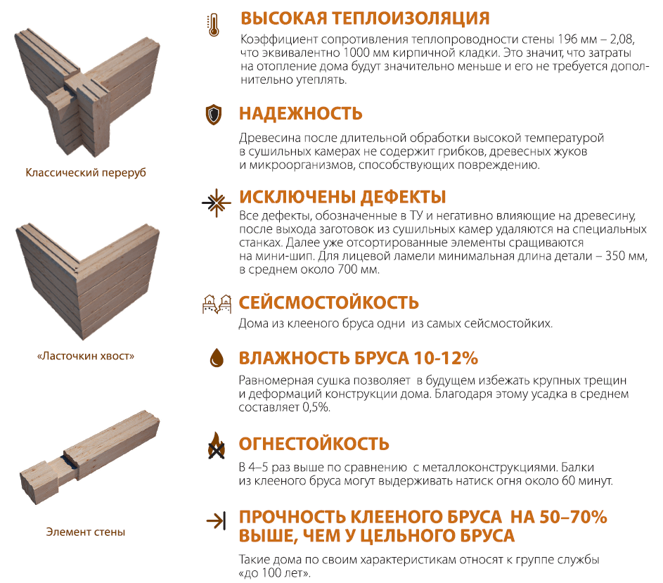 Прежде всего, стоит отметить быстроту возведения домов – они строятся как конструктор. Клееный брус имеет идеально подогнанные соединительные детали и строго выверенные размеры, поэтому скорость возведения построек из него самая высокая. Усадка и усушка у него минимальны, поэтому такой брус является идеальным для «быстрого» строительства.
