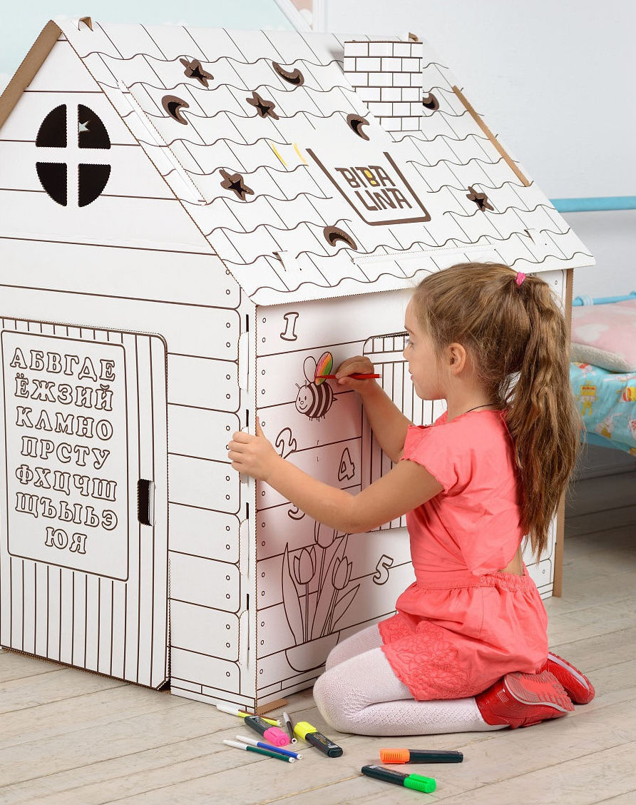 Популярная сейчас разновидность картонных домов — раскраска. На стены, и крышу нанесены рисунки. Ребенок сможет сам декорировать «жилище» — красками или фломастерами. Игрушка так становится еще более интересной.