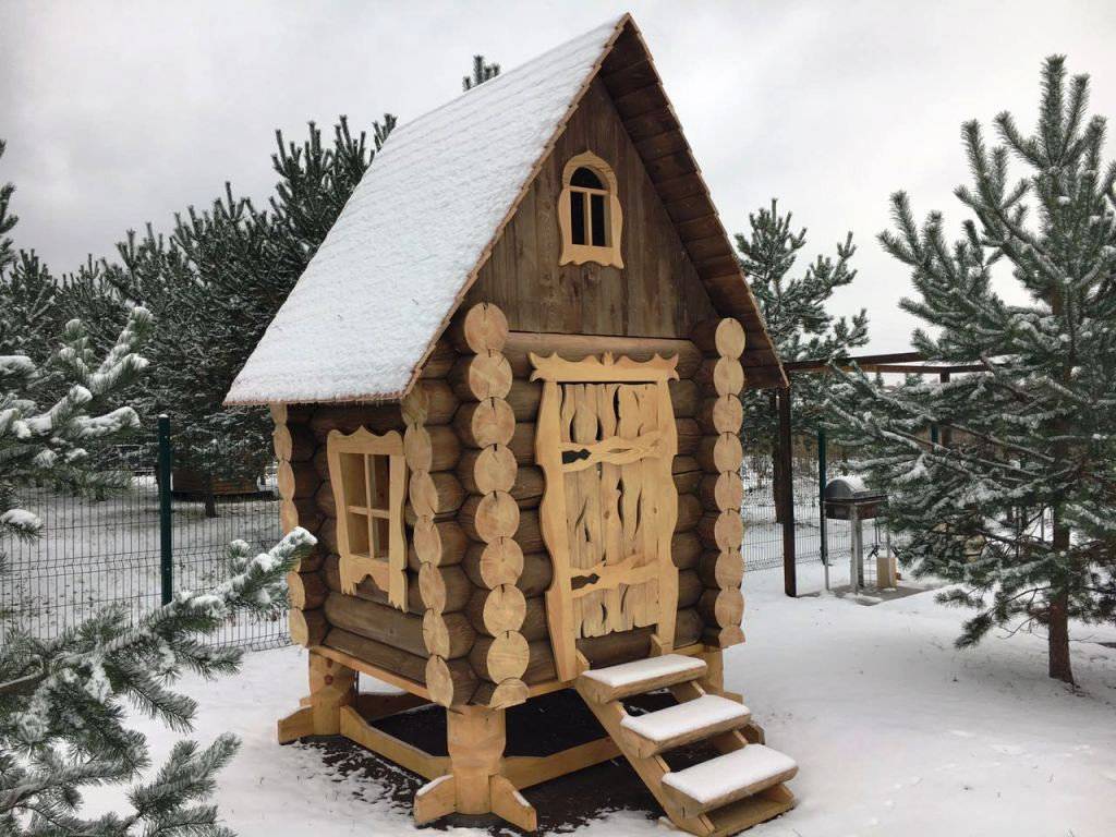 Внутри комнат всегда будет место для столика и стульев, небольшой кроватки. На их пощади даже удастся расположить мастерскую юного техника или кухню для маленькой хозяюшки. Перед домиком есть смысл обустроить веранду или крылечко, а над входом повесить резной козырек.