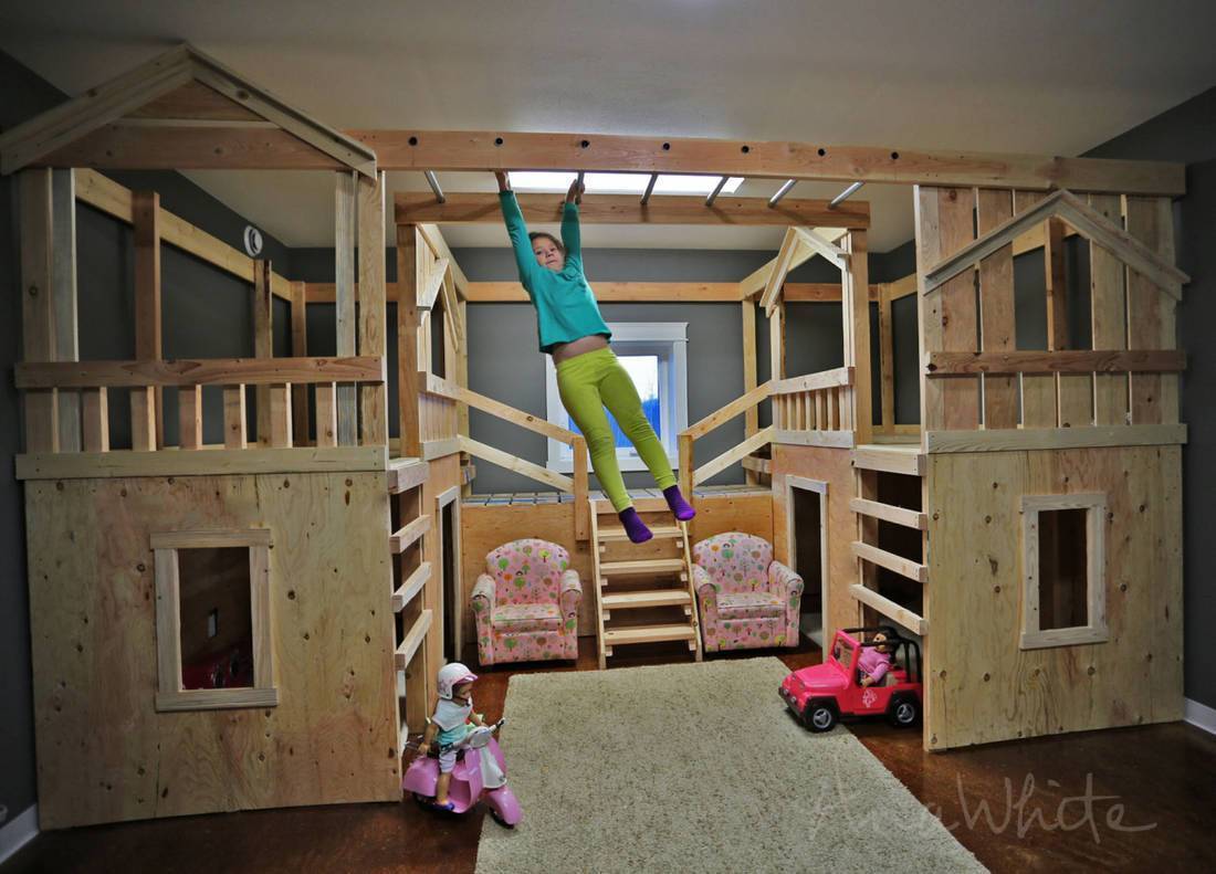 Умельцы, уверенно держащие в руках инструменты, могут замахнуться на двухъярусное сооружение, где на первом этаже смонтирована мебель для детских посиделок, игр и чтения книжек, а на втором этаже будет оборудовано уютное помещение для отдыха. При этом подъемом на верхний ярус может служить не только лестница, но и разнообразные приспособления, тренирующие силу, координацию, ловкость и выносливость.