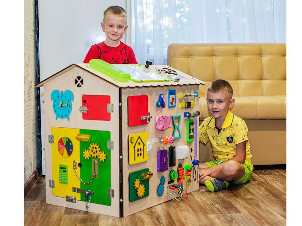 Далеко не все бизидомы предназначены для того, чтобы внутрь смог заходить ребенок. Придется поискать подходящую модель — с дверцами и окошками. Такой домик, в котором ребенку будет не тесно. Для детей до 3-4 лет вполне хватит высокого домика с габаритами 80*70 см.