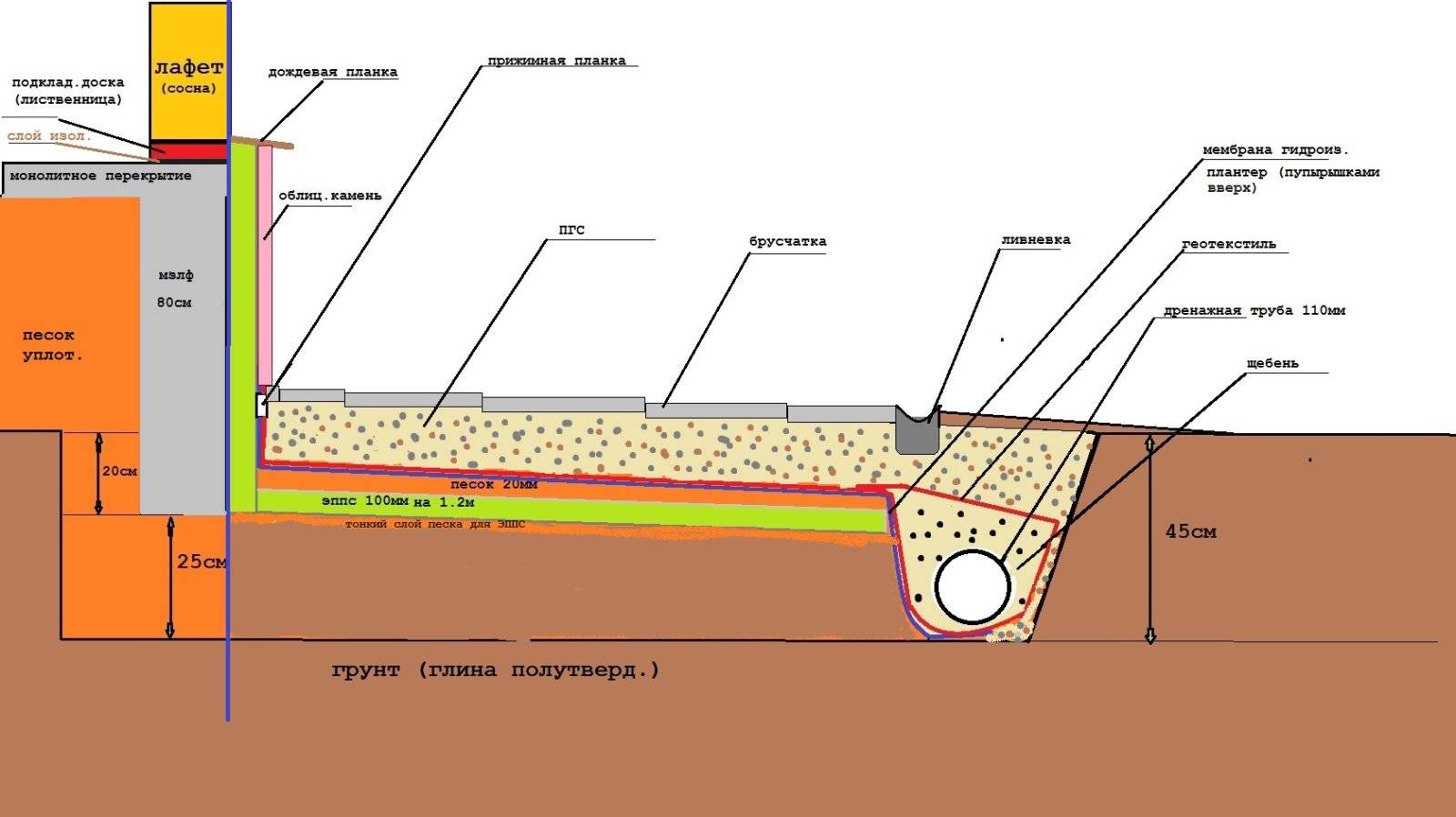 Слоистая структура подстилки и дает название типу дренажа. Необходимо чередовать 10 см песка и 30 см щебня, которым и выравнивается дно котлована.