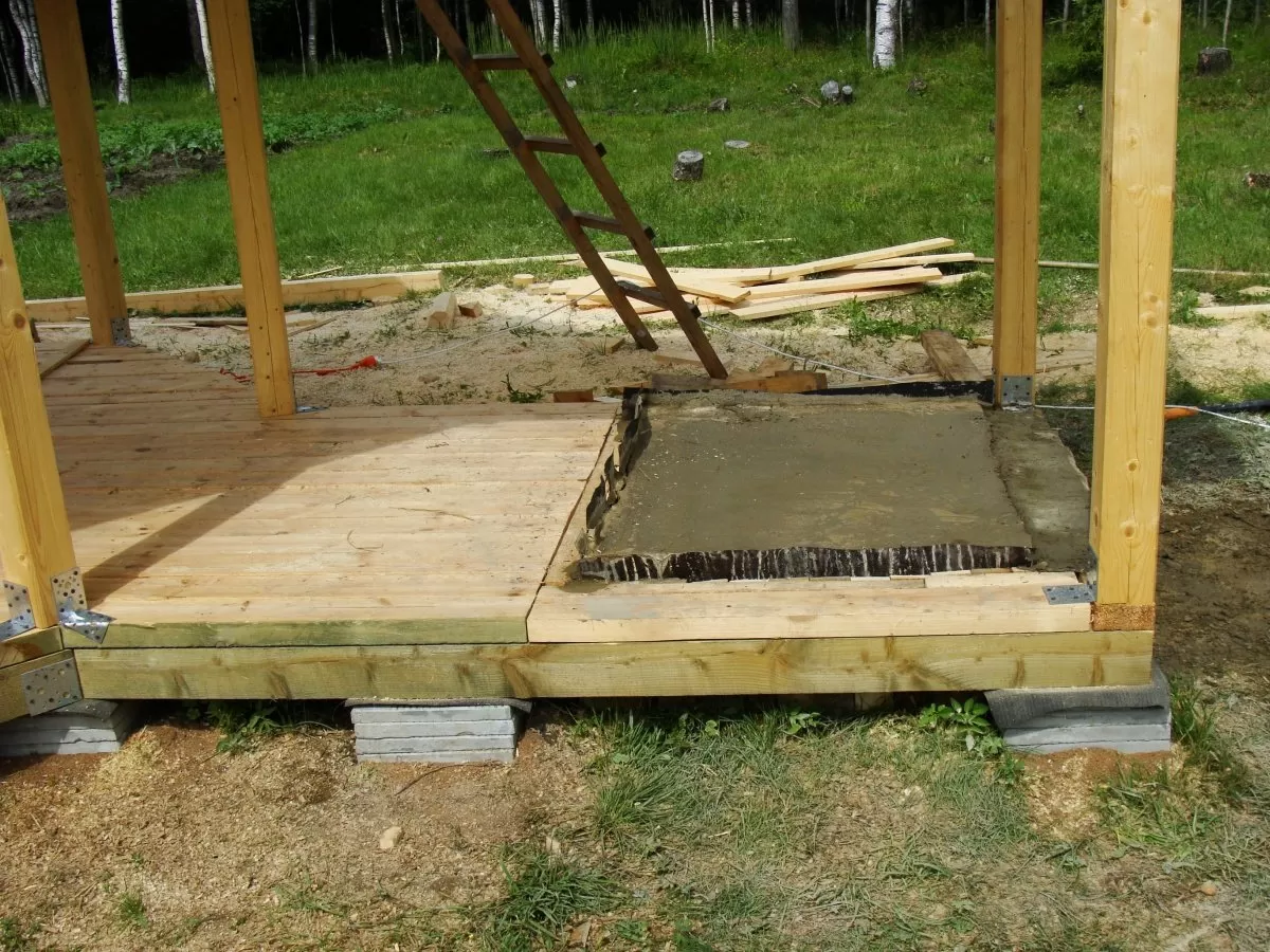 На фундамент укладываются лаги и слепляются с брусьями с помощью саморезов. Сверху лаг необходимо уложить доску на расстояние друг от друга 2 см. Это необходимо для вентиляции.