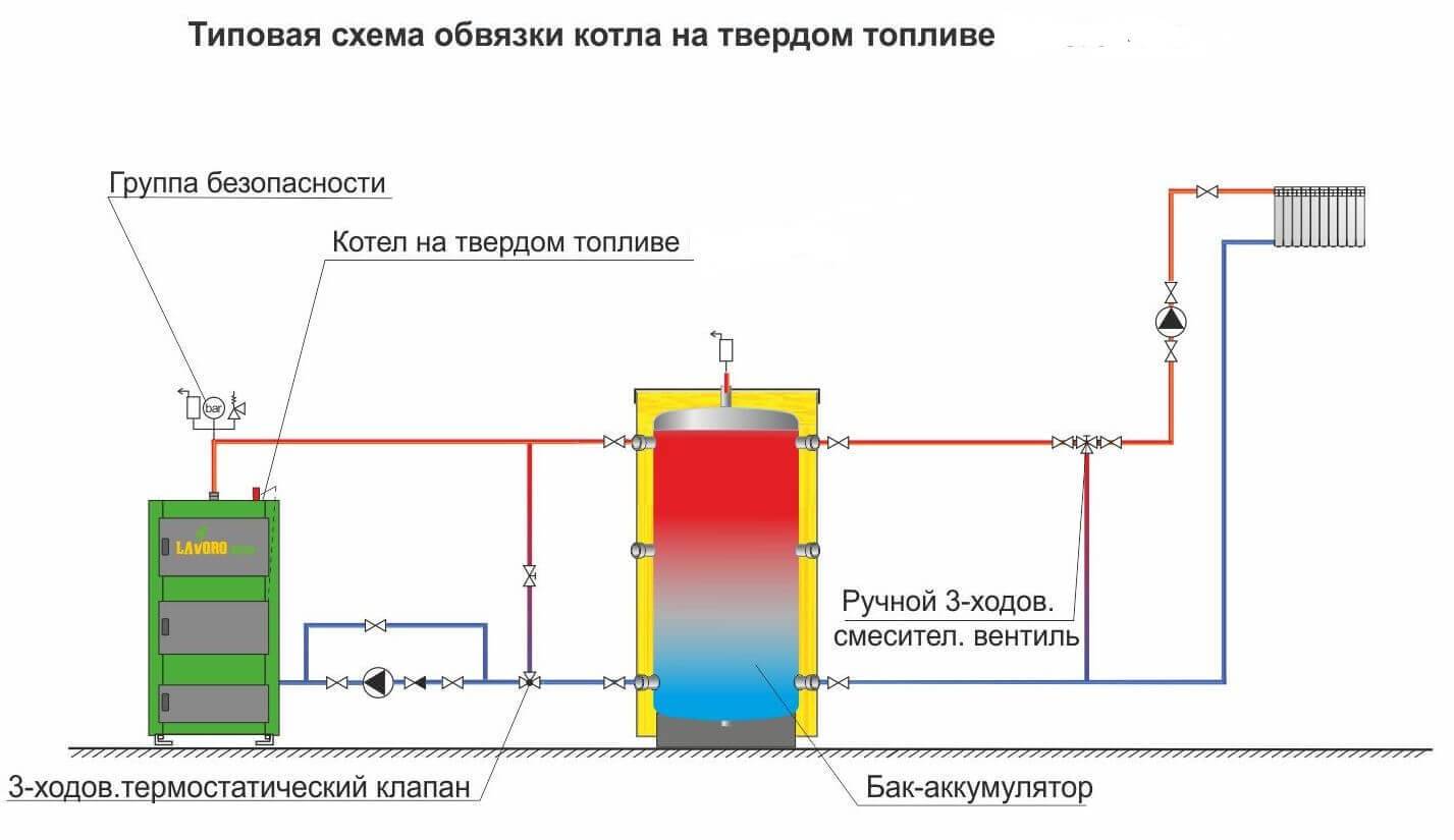 Закончив с монтажом отводящих горючие газы каналов, нужно заняться обвязкой твердотопливного котла, причем в ней есть не меньше тонкостей. Очень часто такие генераторы тепла оснащают баком для воды, который используется в разнообразных схемах подсоединения. Роль устройства состоит в гашении напряжений, которые могут возникнуть при предельной нагрузке на котел.