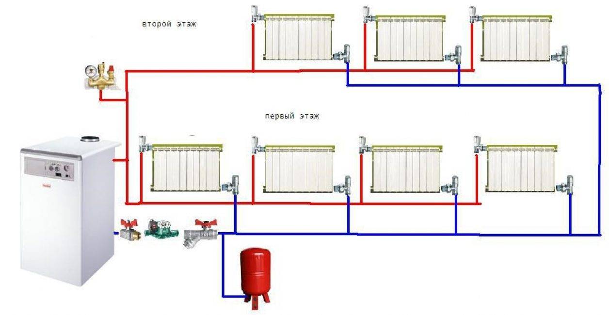 В домах, где два этажа, подобная схема разводки имеет два стояка — подающий и обратный, вертикальная же схема допускает их большее количество. Во время принудительной циркуляции теплоагента с применением насоса температура в помещении повышается намного быстрее. Поэтому чтобы установить такую систему отопления нужно использовать трубы с меньшим диаметром, нежели в случаях естественного движения теплоносителя.