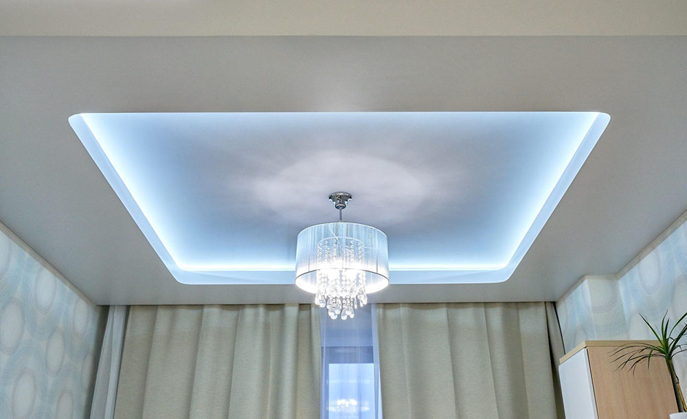 - Установка только второго уровня — при достаточно выровненной поверхности потолка, используемой в качестве базовой, в помещении устанавливается второй уровень. Таким образом, получается двухуровневый потолок с дополнительным уровнем из гипсокартона, который можно оборудовать подсветкой. Осветительные приборы монтируют в межуровневом пространстве и световой поток может быть направлен как вниз, так и вверх.