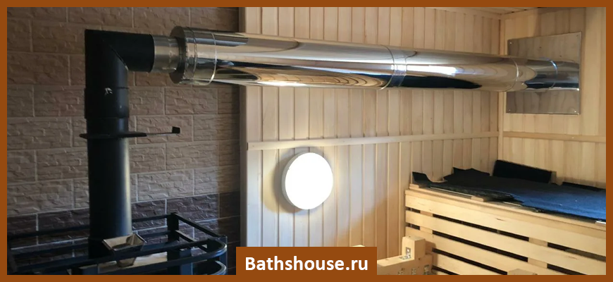 У внутреннего дымохода только небольшая часть находится за пределами бани. Отвод продуктов сгорания происходит вертикально вверх — труба проходит сквозь потолок и крышу. Отсутствие поворотов улучшает тягу. Большая часть конструкции находится внутри помещения, ускоряя прогрев парной и смежных помещений.