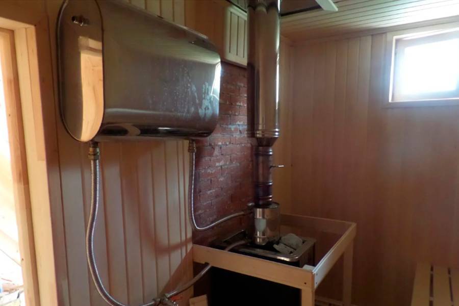 Чтобы не только париться, но и выполнять водные процедуры, нужно установить котел с баком для воды. Это стандартная конструкция, состоящая из следующих элементов: