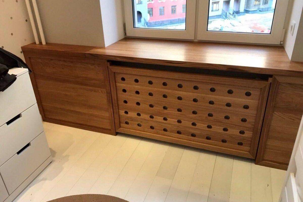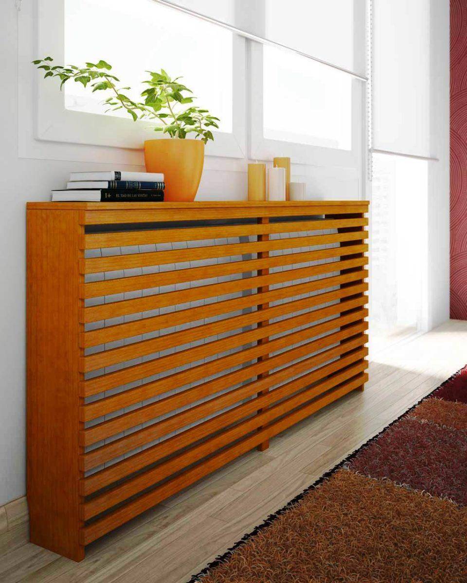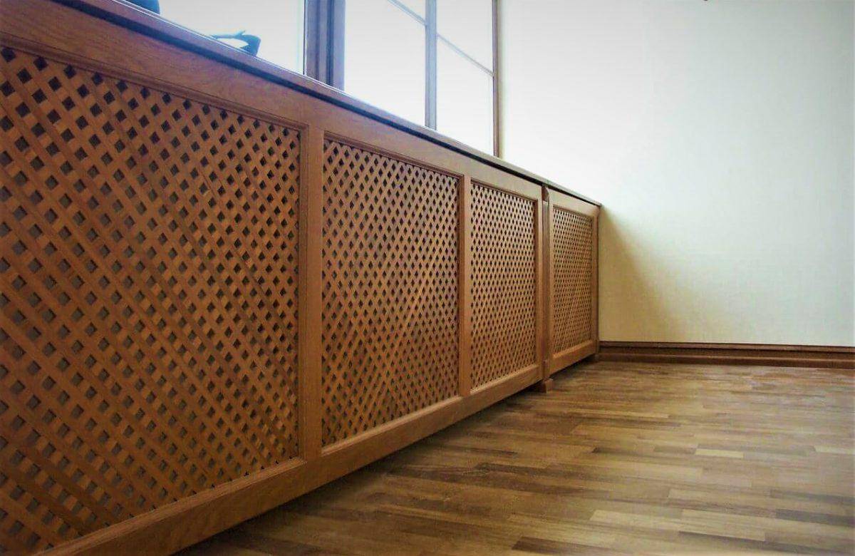 При изготовлении экранов из дерева могут использоваться как дорогостоящие материалы, такие как дуб, бук, ротанг, или более дешевые варианты – МДФ, реечное полотно. Деревянные панели изготавливаются в виде решеток или жалюзи, и устанавливаются на некоторой высоте над полом для того чтобы они не препятствовали прохождению тепла от радиатора. Сверху короба также делаются отверстия. Деревянный экран очень просто сделать самостоятельно, придав ему любую форму, но дерево обладает плохой теплопроводностью, поэтому часть тепла от радиатора он будет поглощать.