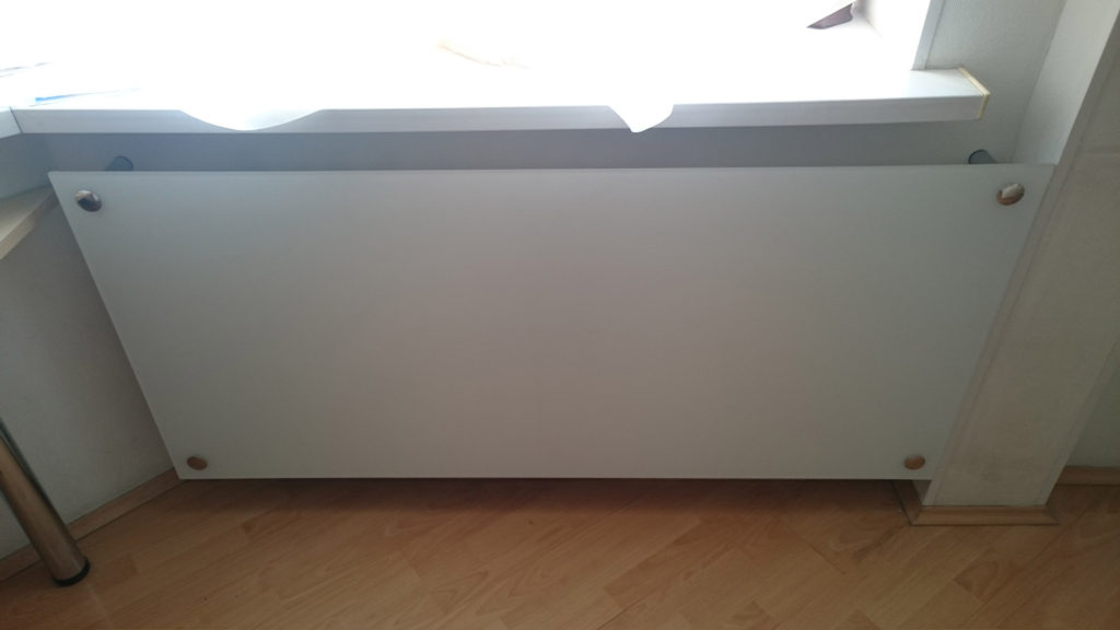 Основной минус – достаточно близкий контакт батареи и короба, что препятствует правильной циркуляции воздуха. Кроме того, материал экрана контактирует с горячей поверхностью, что не проходит бесследно для дерева и пластика.