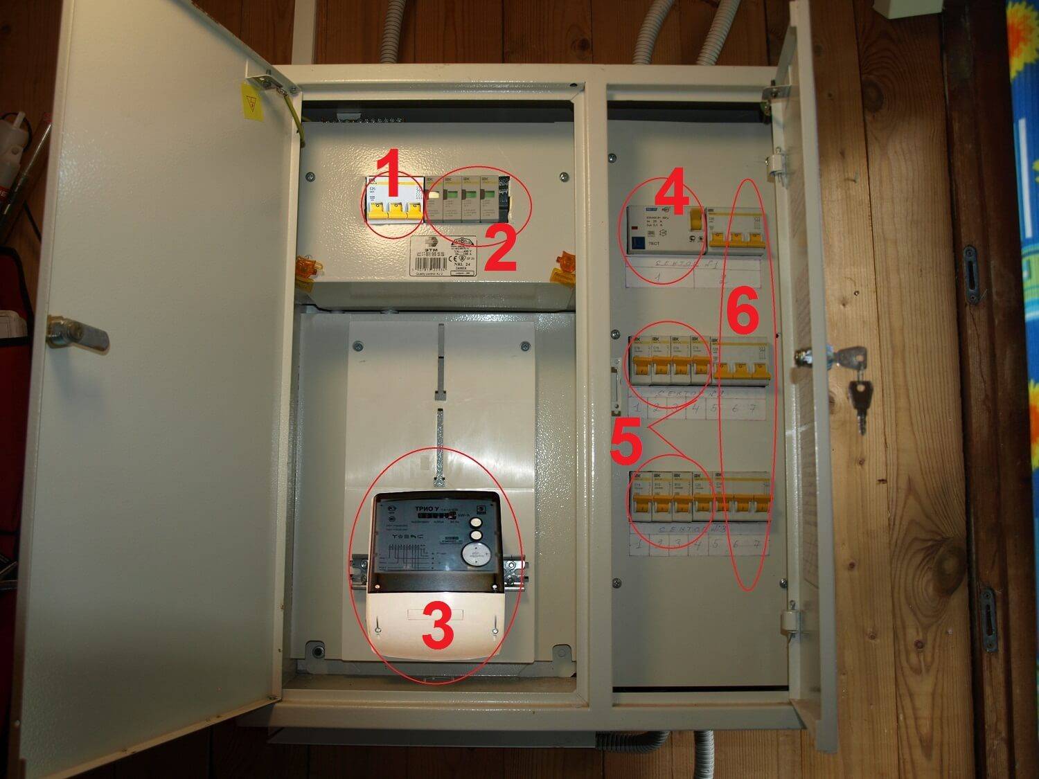 Щиток представляет собой коробку из металла или пластика, внутри которой находится опломбированный счетчик и автомат, предотвращающий замыкание. Устанавливается также дополнительный автомат на 16 или 25 А, самостоятельно отключающий питание дома с целью предотвращения возгорания проводки в случае резкого повышения напряжения.