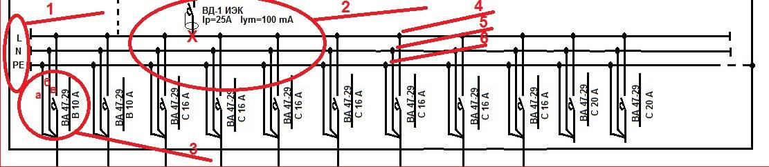 - Фаза, идущая с общей жилы, через автоматический выключатель на свою группу.