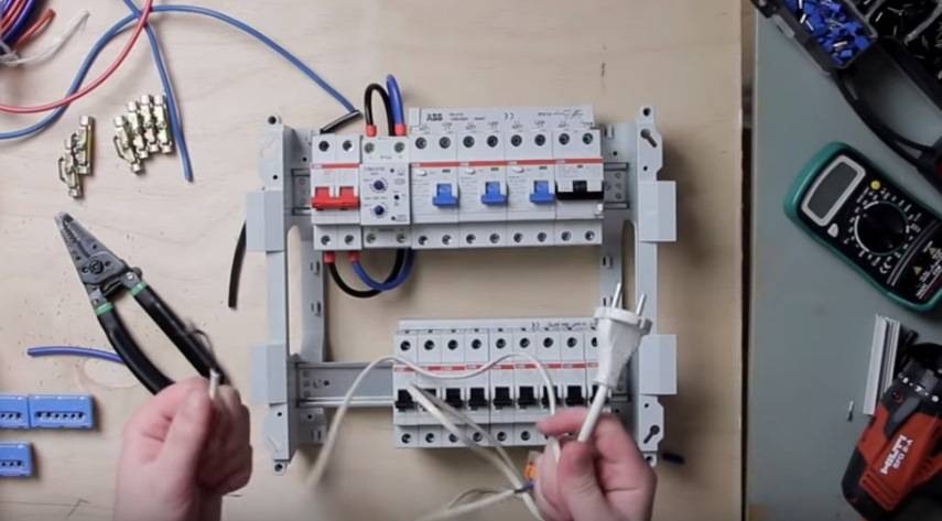 Выполнив эти операции, следует проверить работоспособность получившегося узла. Для этого можно взять питающий провод с вилкой и обжатыми свободными концами. Концы вставляются в автомат, а вилка втыкается в розетку. Выставив предельную величину срабатывания УЗМ, включают рубильник и приступают к проверке.