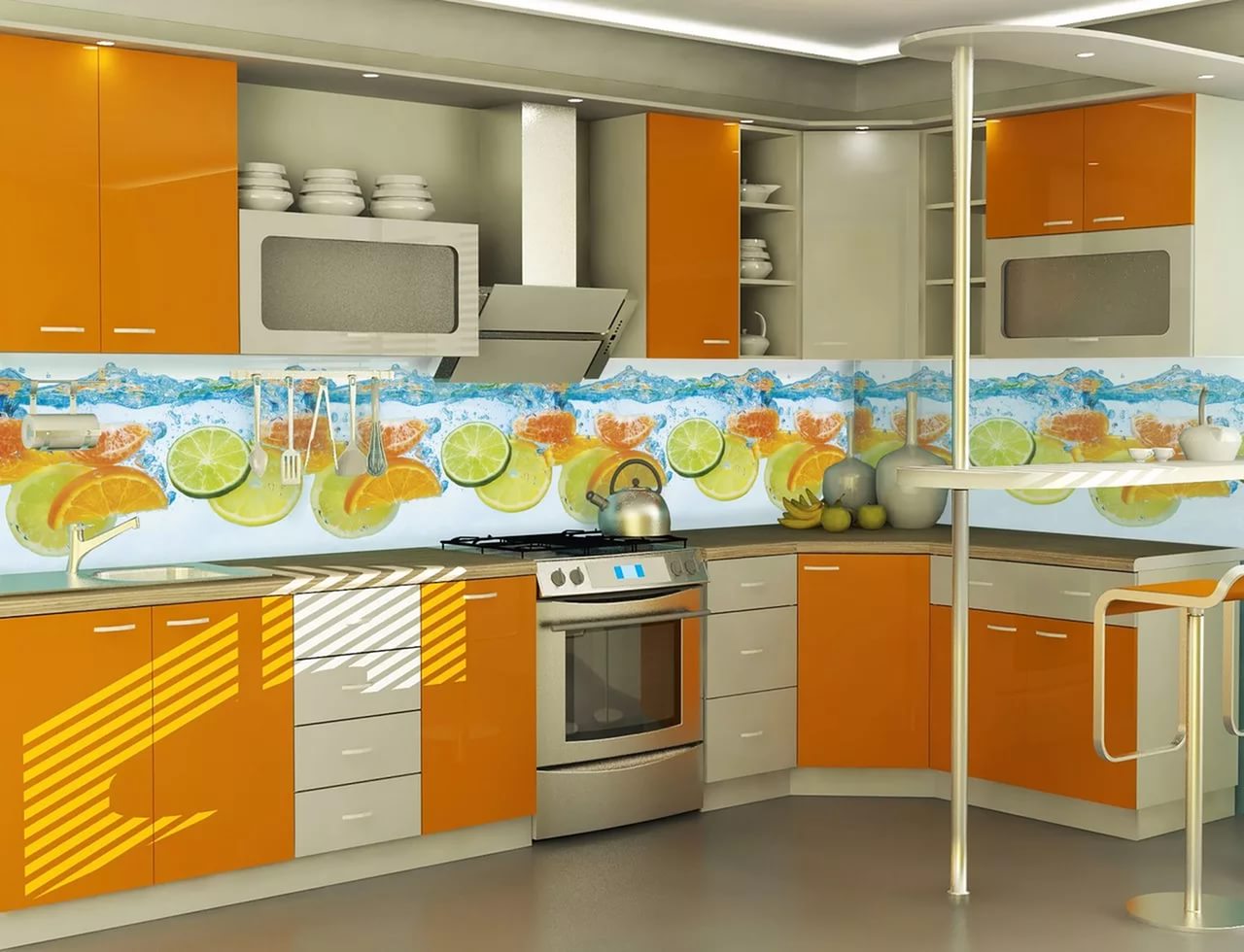 Белой или однотонной кухни фартук можно принарядить – сочные цвета идеально подходят для этой роли, но в небольших помещениях принт или рисунок лучше предпочесть не крупный. В просторных кухнях уместны и макроизображения.