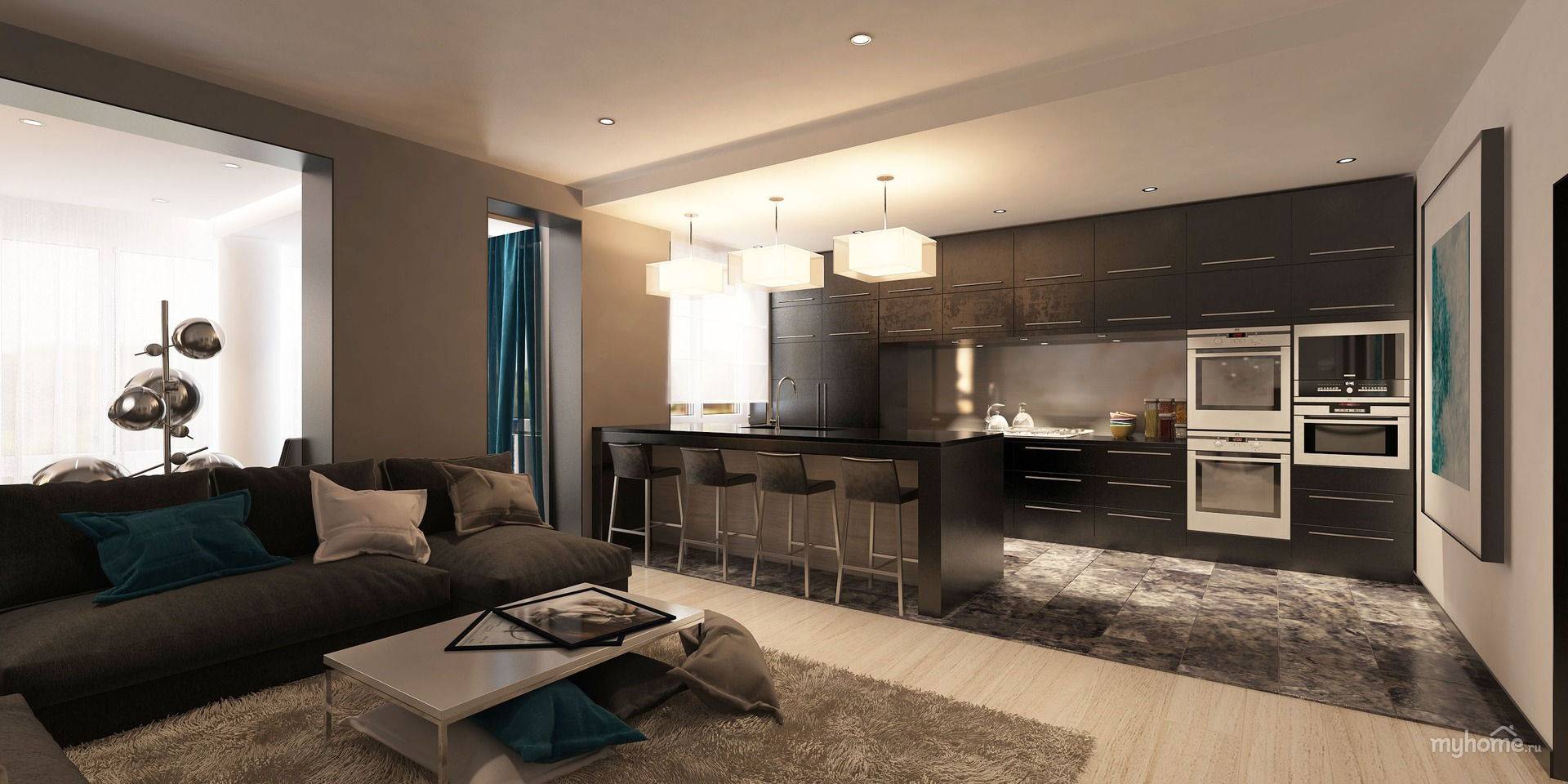 Кухню от комнаты удобно отделить обеденной барной стойкой