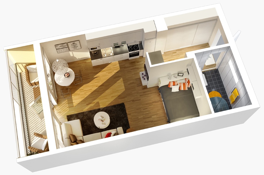 Этот тип устройства квартиры полюбился свободным, творческим личностям, жаждущим свободы и разрушения привычных рамок. Немаловажную роль в том, что данный тип помещений начал приобретать популярность сыграло и то, что квартиры студии являются чрезвычайно практичными и удобными. Здесь одновременно все находится на своих местах и в то же время – под рукой. Таким образом, основной характеристикой таких квартир является пространство без перегородок.