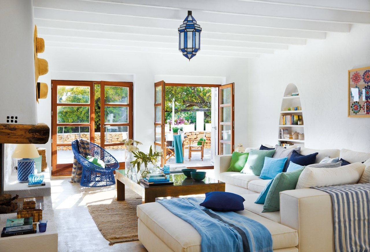Совершенно особое обаяние помещению привносит разноцветный текстиль. А итальянский колорит интерьеру придают грубо отесанные балки на потолке с парящими, как маленькие облака, светильниками.