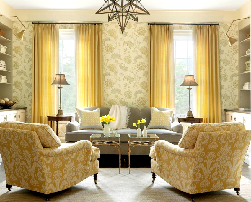 Чтобы оформление окна гармонично сочеталось с уже существующей обстановкой гостиной, нужно правильно подобрать портьеры к интерьеру. Комбинируются шторы с самыми крупными декоративными элементами в комнате — мягкой мебелью либо обоями на стенах.