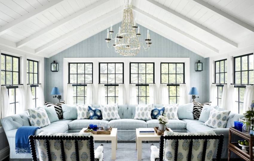 Страна – это воплощение мечты о лете в деревне у бабушки, в ее уютном домике с обилием покрывал, пледов и подушек. Для таких домов характерно использование небольших раздвижных занавесок со складками, рюшами, бантами, цветочным орнаментом.