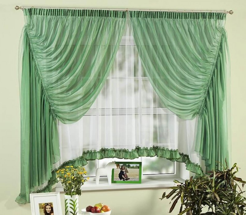 Оконный текстиль лучше подобрать таким образом, чтобы он соответствовал по цветовой гамме с обоями и предметами меблировки. Если стены оформлены в оттенок фисташки или оливок, то шторы желательно повесить кофейного, белоснежного или алого тона.