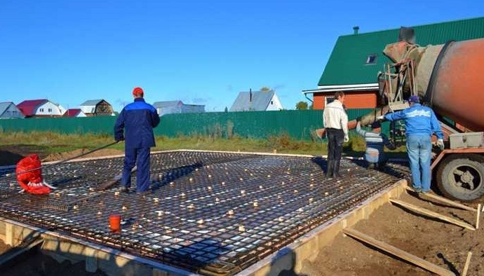 Заливка бетоном при возведении фундамента на основе бетонной плиты