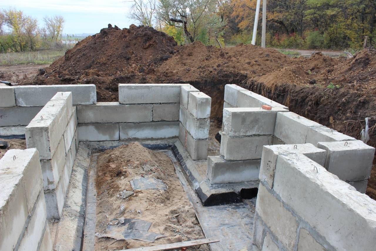- Бетонные блоки. В этом случае своими руками все проделать будет сложнее, поскольку блоки из бетона даже вдвоем поднять весьма проблематично. Потребуется применение техники, как минимум талей или лебедки. Зато скорость сооружение намного выше. Блоки укладываются в соответствии с проектом и скрепляются раствором. Для надежности их необходимо стянуть проволокой. К недостаткам следует отнести необходимость устройства повышенной гидроизоляции, особенно если подвал достаточно заглублен, а уровень грунтовых вод высок.