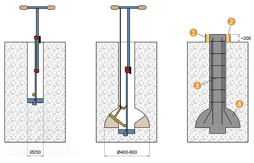Если грунт рыхлый, то в шурф заливается вода для его уплотнения. Также, если почва твердая, вода размягчит ее. Необходимо контролировать вертикаль при бурении. Всю «подошву» нужно освободить от грунта.