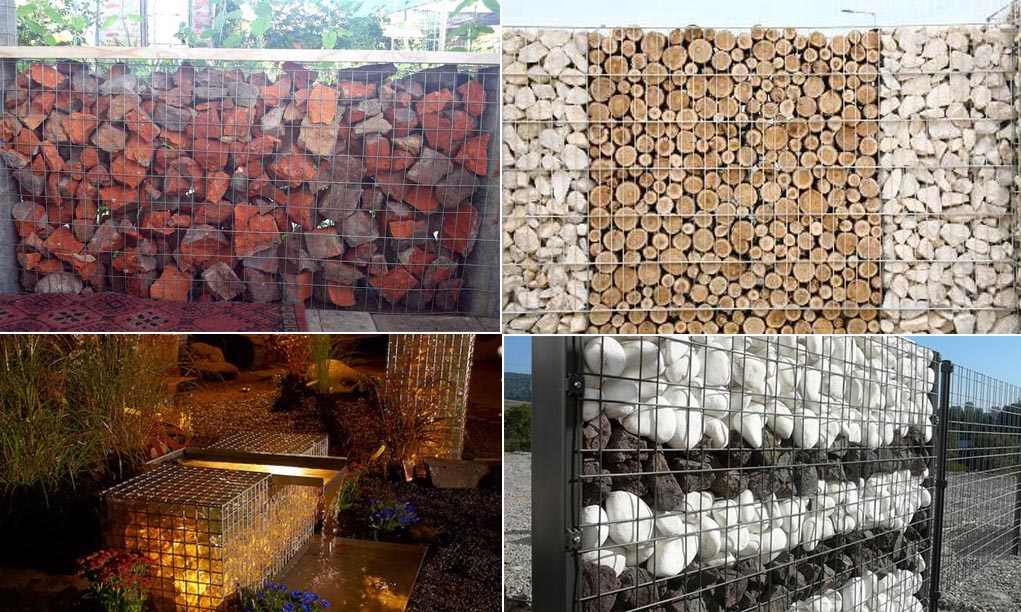 Чаще всего в качестве наполнителей применяют туф, плотный/мягкий известняк, трахиты, гранит, базальт, сланец. Декоративные габионы делают из стеклянного камня.
