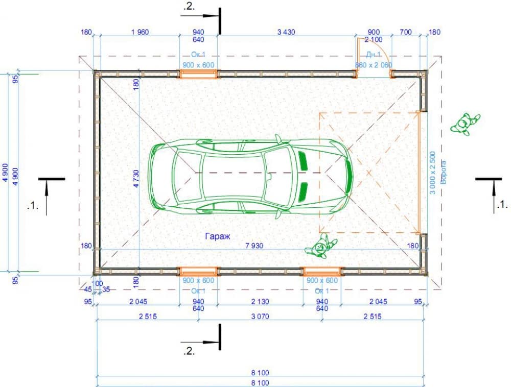 Задумывая строительство гаража, довольно просто представить себе отдельно стоящее здание из четырех стен, металлических ворот, отдельным входом в виде двери и нескольких окон для естественного освещения. Такой вид постройки с внешней стороны не имеет ничего особенного — стены имеют простую стеновую кладку со смещением на 1/2 блока, двери и ворота устроены на металлической раме, встроенной в стену, все окна имеют стандартные размеры. Однако для проектирования, а особенно для расчета количества необходимых блоков на строительство, такой информации явно недостаточно.