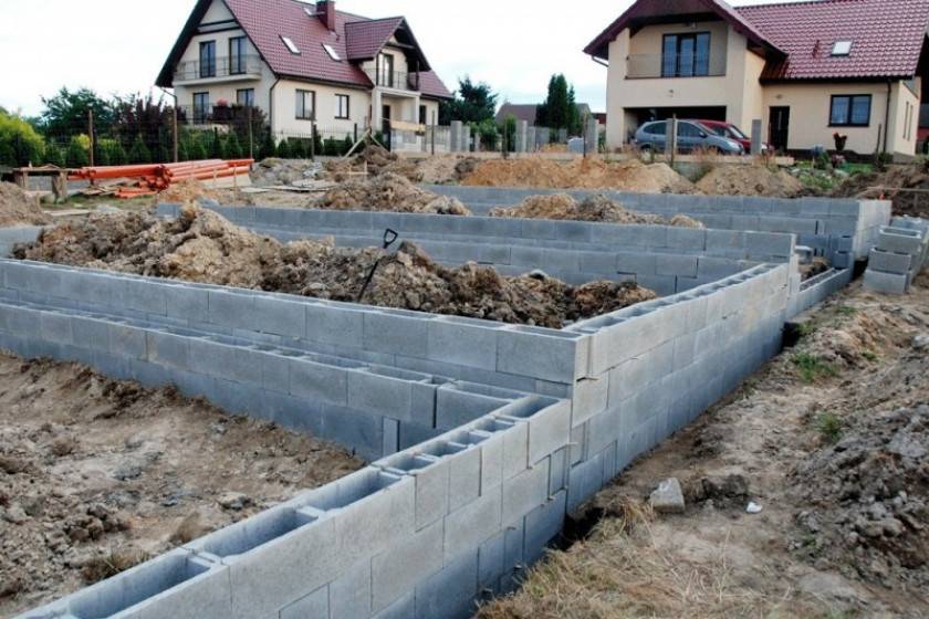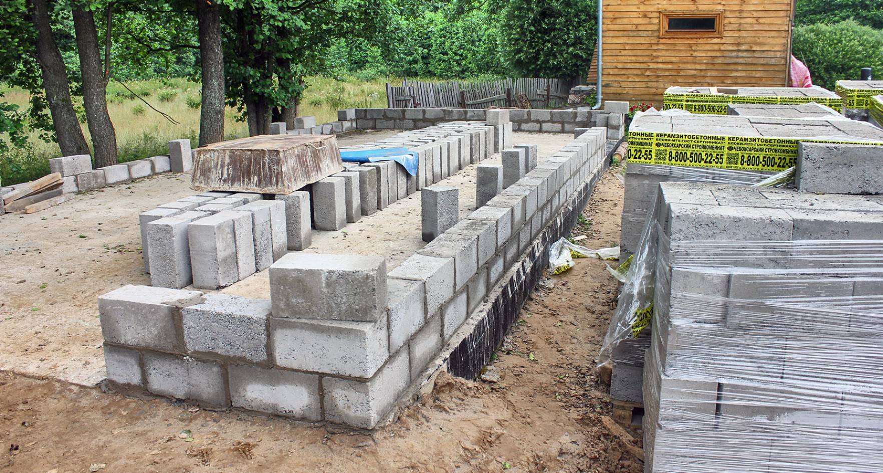 Ширину фундамента рекомендуется делать равной шириной керамзитобетонных блоков. В ином случае стеновые блоки придется обрезать.Порядок работ следующий: