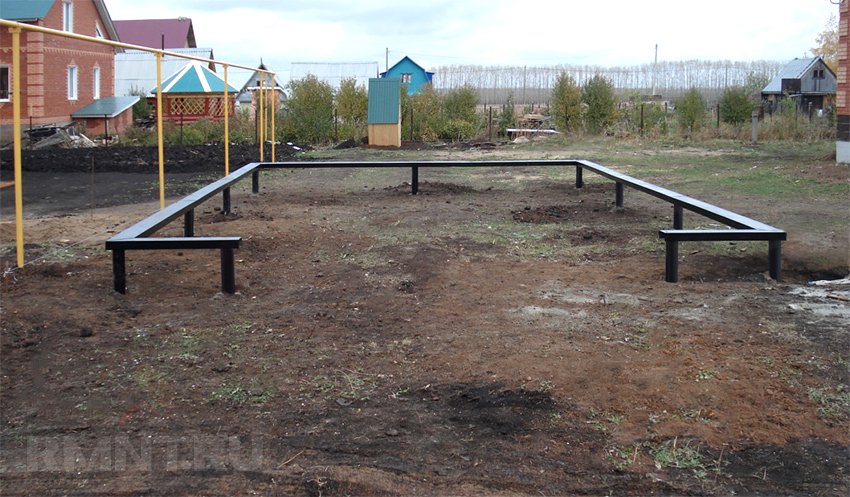 Каждый поперечный ряд центральных свай накрывают швеллером 12 или 14 профиля. Так образуется система несущих лаг пола. Они должны выступать за внешнюю плоскость каркаса не менее чем на толщину используемых панелей.