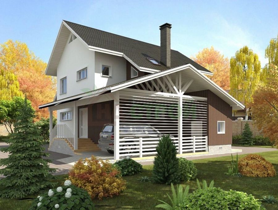 - Совмещенный, или встроенный в дом. Такой вариант считается наиболее привлекательным, но имеются и некоторые неудобства — выхлопные газы от работающего двигателя неминуемо попадают в дом, что не понравится никому. Это вынуждает помимо гаража сооружать еще и навес, под которым автомобиль можно прогреть, отремонтировать или просто оставить для стоянки. Тем не менее, удобство пользования и близость расположения такого гаража самые высокие.