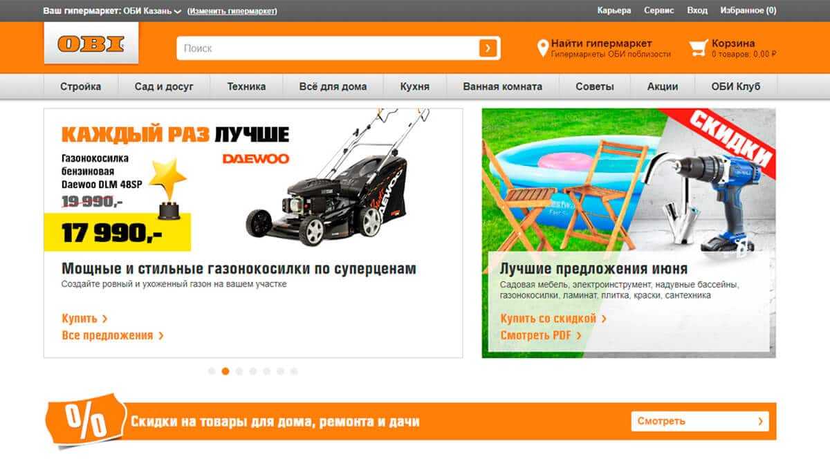 OBI доступен для онлайн-заказов не только жителям больших городов. Курьерские и почтовые службы привозят заказ к дому в кратчайшие сроки. Помимо стройматериалов можно купить строительные инструменты, садовую мебель, кухонные гарнитуры, душевые кабины и раковины. OBI – лучший ритейлер товаров для дома, дачи и ремонта в рейтинге 2021 года.