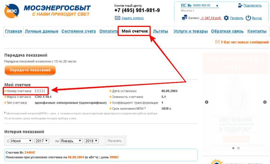 Номер счетчика электроэнергии есть на его лицевой панели, а также в счете за электроэнергию, который присылают по почте. Точнее, должен быть, и в моем случае есть. Если есть инструкция на счетчик, которая идет с ним при покупке, там тоже должен быть указан номер.